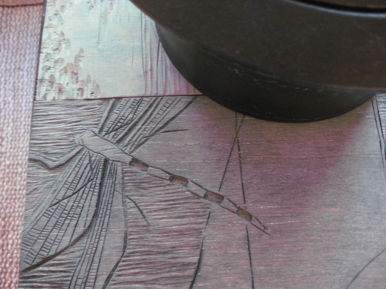kuvio puuta kaivertaen, tähän pannunaluseen sudenkorento!