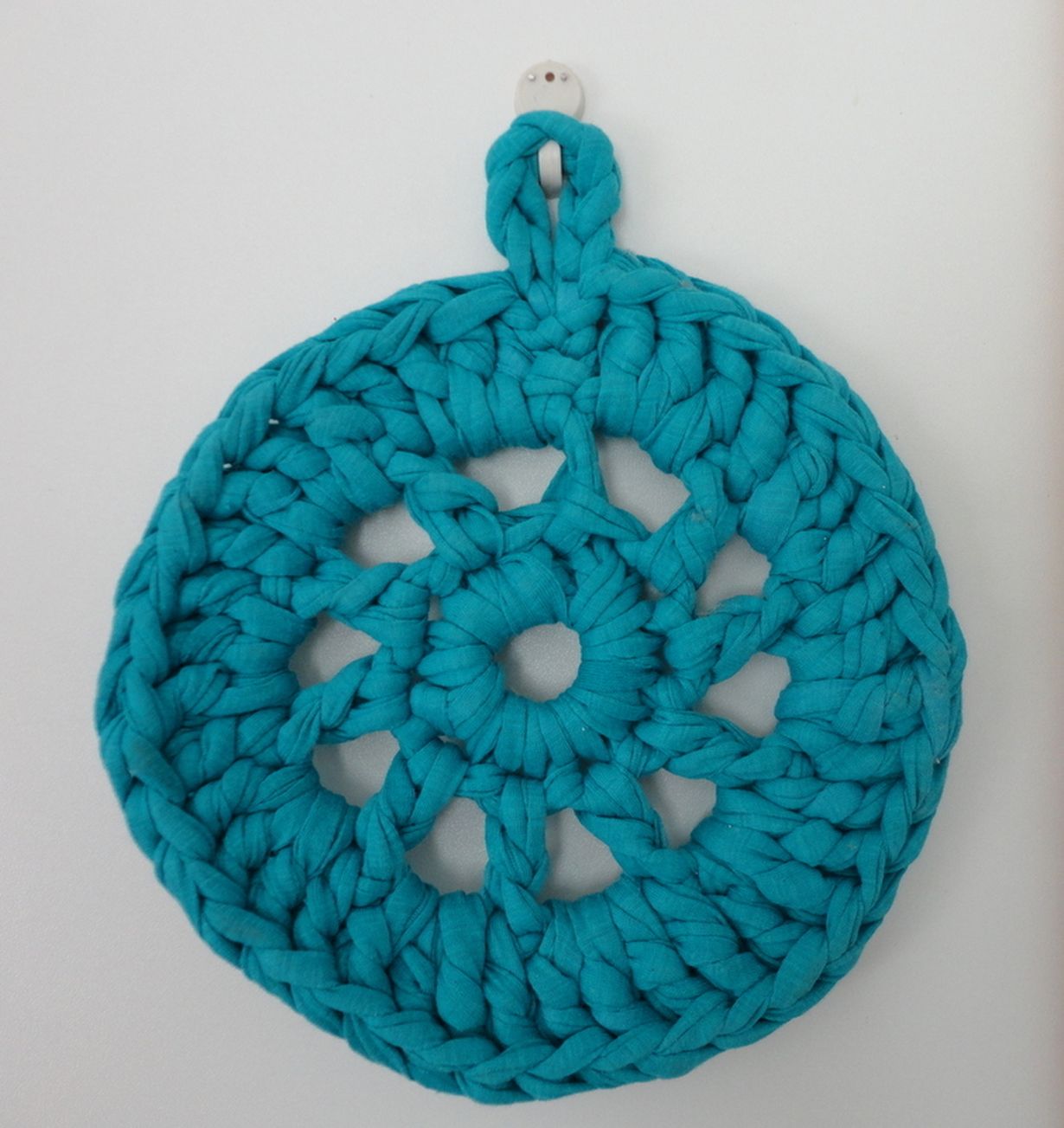 Virkkasin trikookuteesta mattoja ja kudetta jäi hieman jäljelle. Löysin netistä tällaisen pannunalusen kuvan. Sain tehtyä useammankin, yhden jätin itselle kun on niin kivan värinen.