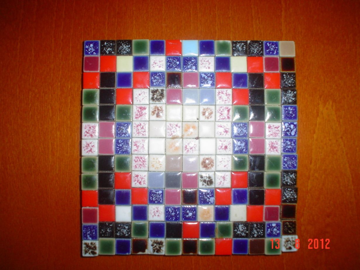 Tämän ihanan mosaaikkisen pannunalusen on tehnyt yksi lapsistani,muistaakseni sain sen äitienpäivälahjaksi.Valitettavasti tekijä on unohtanut kirjoittaa nimensä alusen taakse. Ikää alusella on n. 20-30 v.