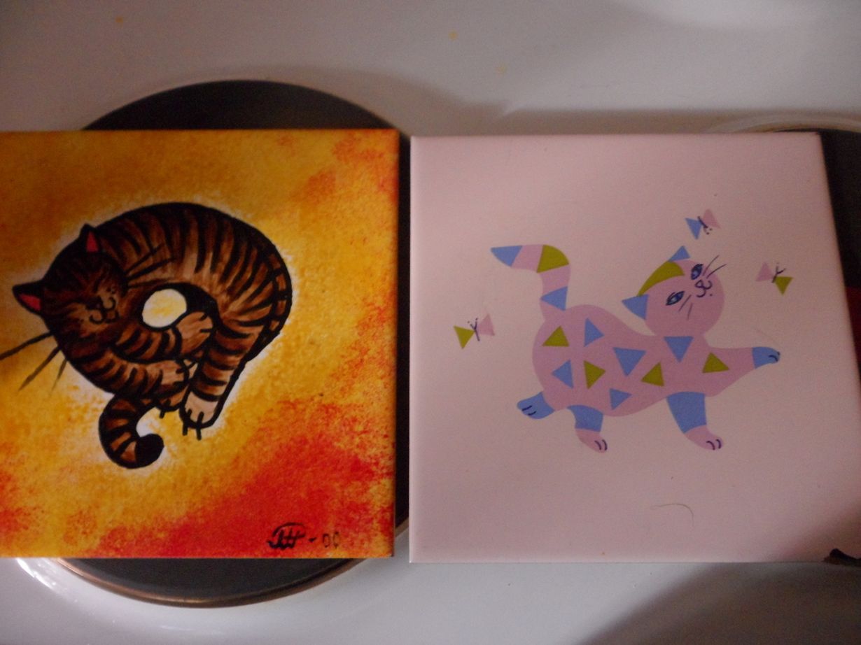 Minulla on kaksi keraamista laattaa joita käytän pannunalusina. Toinen on jonkun itsemaalaama, ystävä oli ostanut sen kirpparilta. Molemmat olen saanut lahjaksi. Harmi vain että viime viikolla pudotin painavan astian toisen laatan päälle ja kulma särkyi...