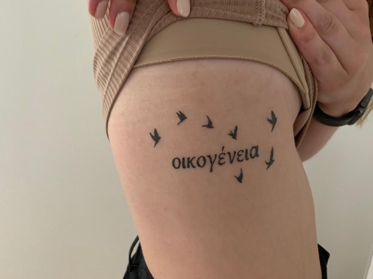 Tatuoinnissa lukee perhe kreikaksi ja linnut muodostavat Otavan tähtikuvion. Tatuointi on otettu oman pappani muistoksi, jonka kanssa aina katselimme tähtitaivasta. Kreikankieli taas tulee siitä, että siellä oli isovanhempieni ”kesämökki”.