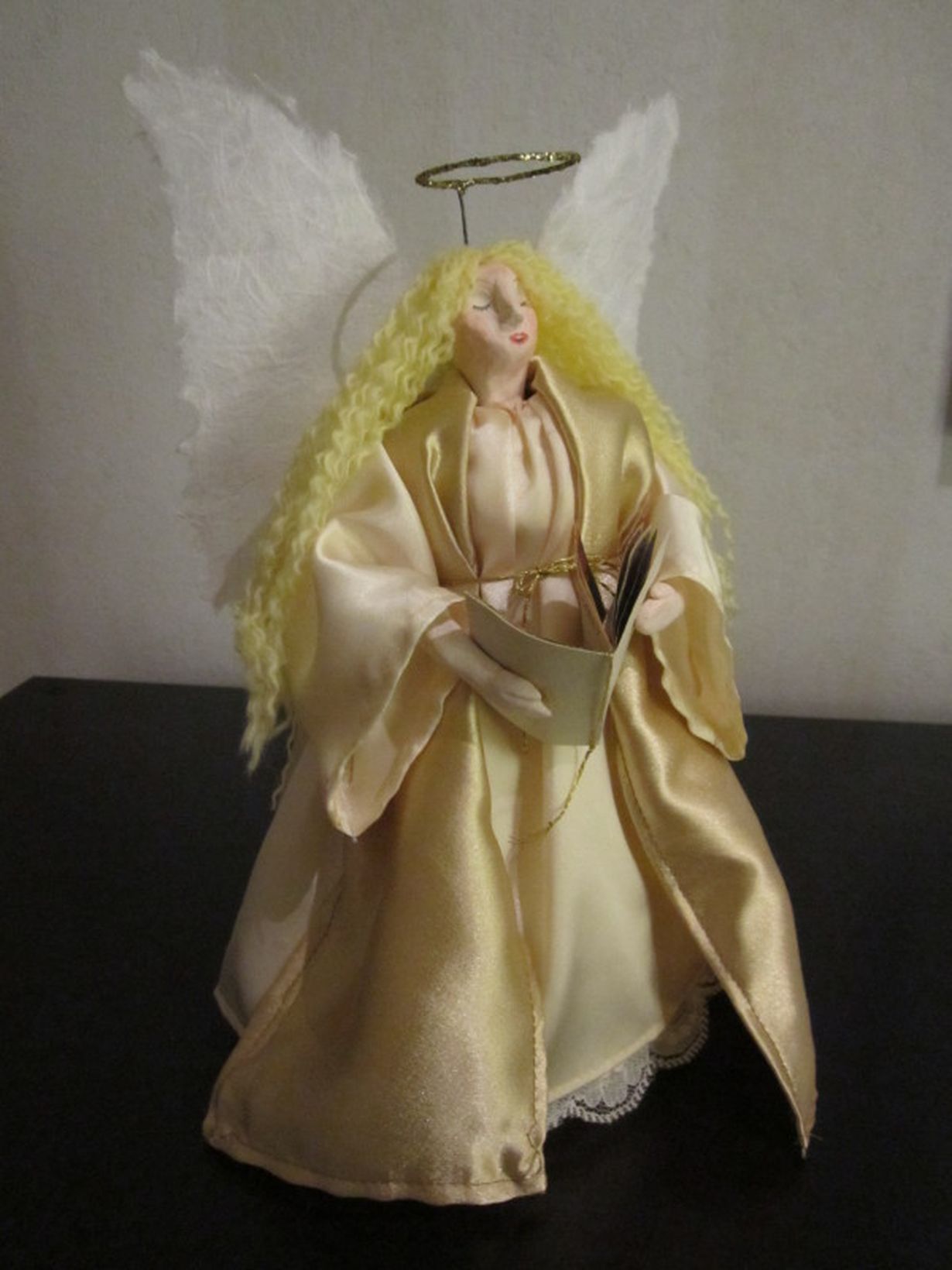 Enkeli askarreltiin aikoinaan suurella vaivalla paperimassasta, rautalanganpätkistä ja kankaanpaloista jonkin lehden ohjeen mukaan. Sen valmistuttua mieheni kommentoi sen olevan vähän kirveellä veistetyn näköinen, suorastaan miehekäs. Pakko olla jokseenkin samaa mieltä, joten kultakutri sai nimekseen Åke.