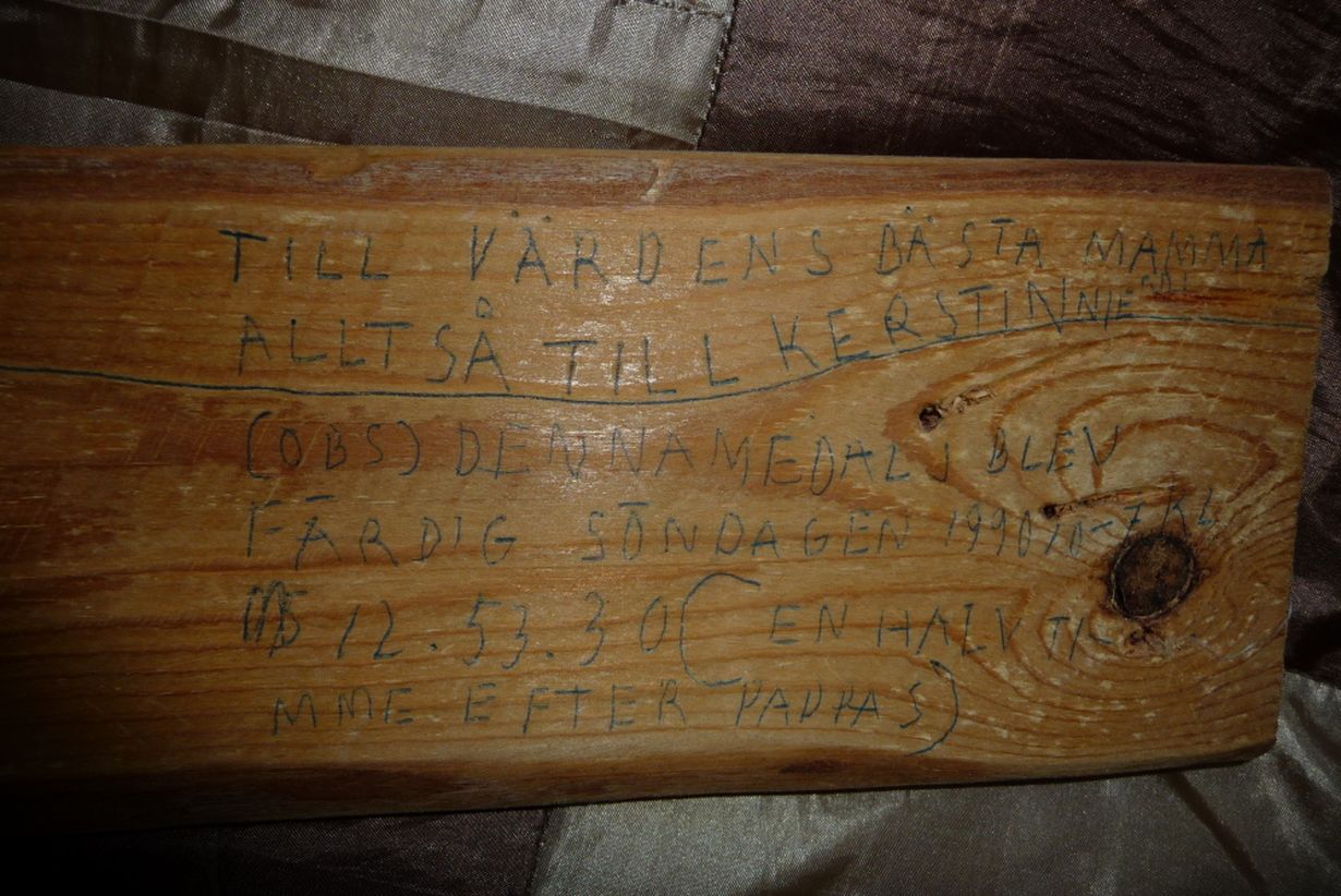 Tämä ei kylläkään ole äitienpäiväkortti, mutta se on mitali jonka lapseni ovat tehneet minulle kun olivat pieniä. He olivat usein isoisänsä kanssa autotallissa joka toimi enemmänkin puuverstana, siellä he askartelivat kaikenlaista. Tässä mitalissa on minusta niin hauska teksti. Teksti on ruotsiksi mutta käännettynä näin: "Maailman parhaalle äidille, siis Kerstin Niemelle. Tämä mitali valmistui 1990-10-07 klo 12:53:30 (puoli tuntia isän mitalin jälkeen)"