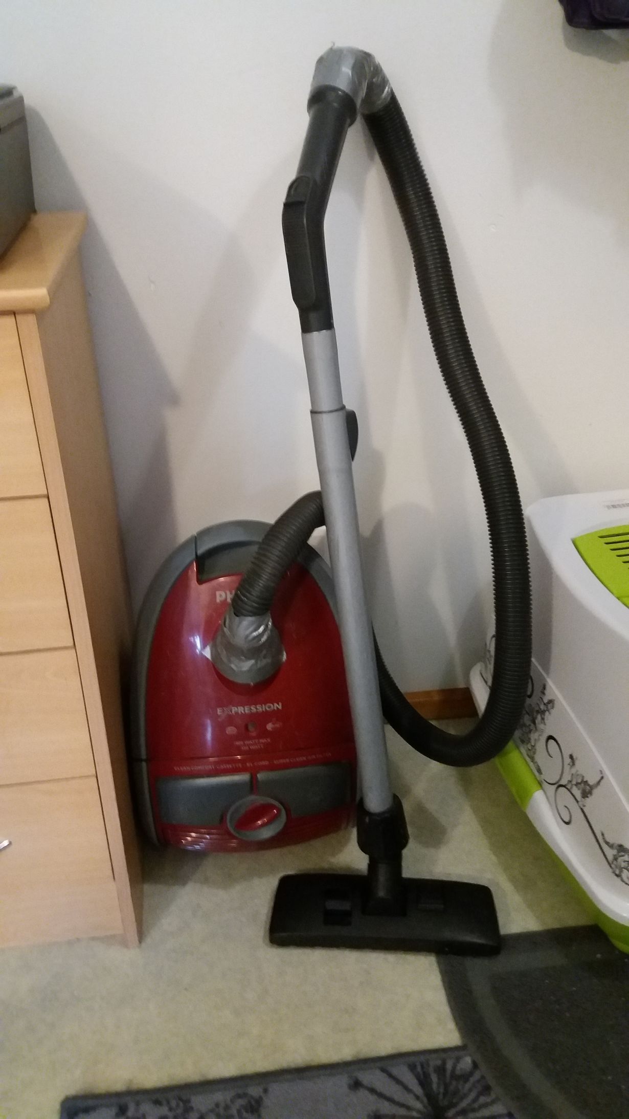 Imuri on lempikodinkoneeni. Niitä onkin jo muutama ollut. Tämän hetkinen on laadukkaampi Philips Expression, löytö kirpparilta muutaman vuoden takaa. Jota on pitänyt jo teippailla. Kissatalous ja karvoja löytyy, joten imurointi on joka päiväistä :)