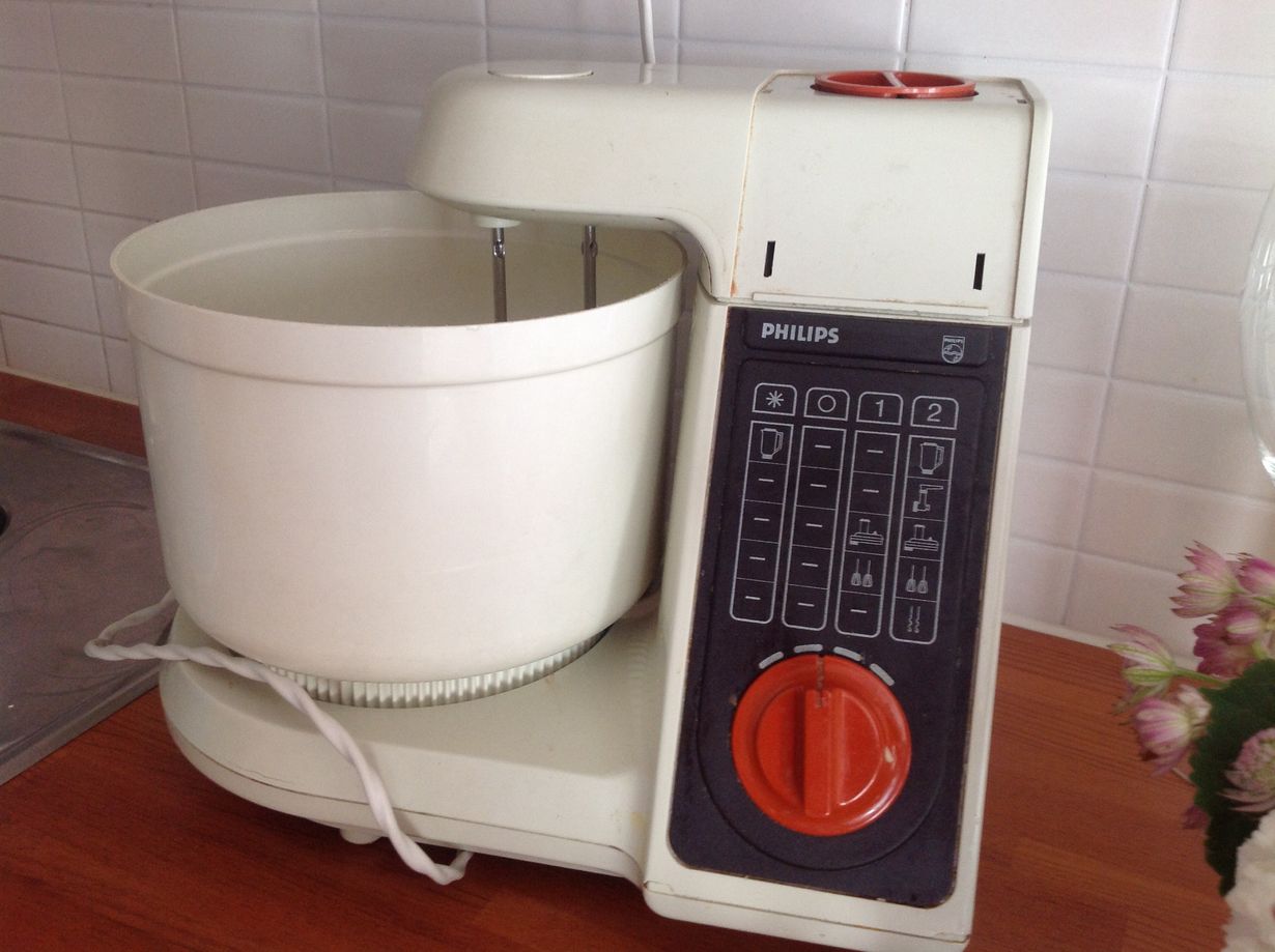 Tämän yleiskoneen saivat ensin enoni vaimonsa kanssa häälahjaksi v. 1978. Muutaman vuoden kuluttua sain koneen heiltä. Siitä asti olen tällä taikinat tehnyt ja koneeseen kuuluu yös raastinosat sekä lihamylly.....nämä siis vielä tänäänkin kovassa käytössä, enkä ole voinut poistaa käytöstä vaikka sain vuosi sitten lahjaksi uuden koneen, on tämä niin paras vanha koneeni :)