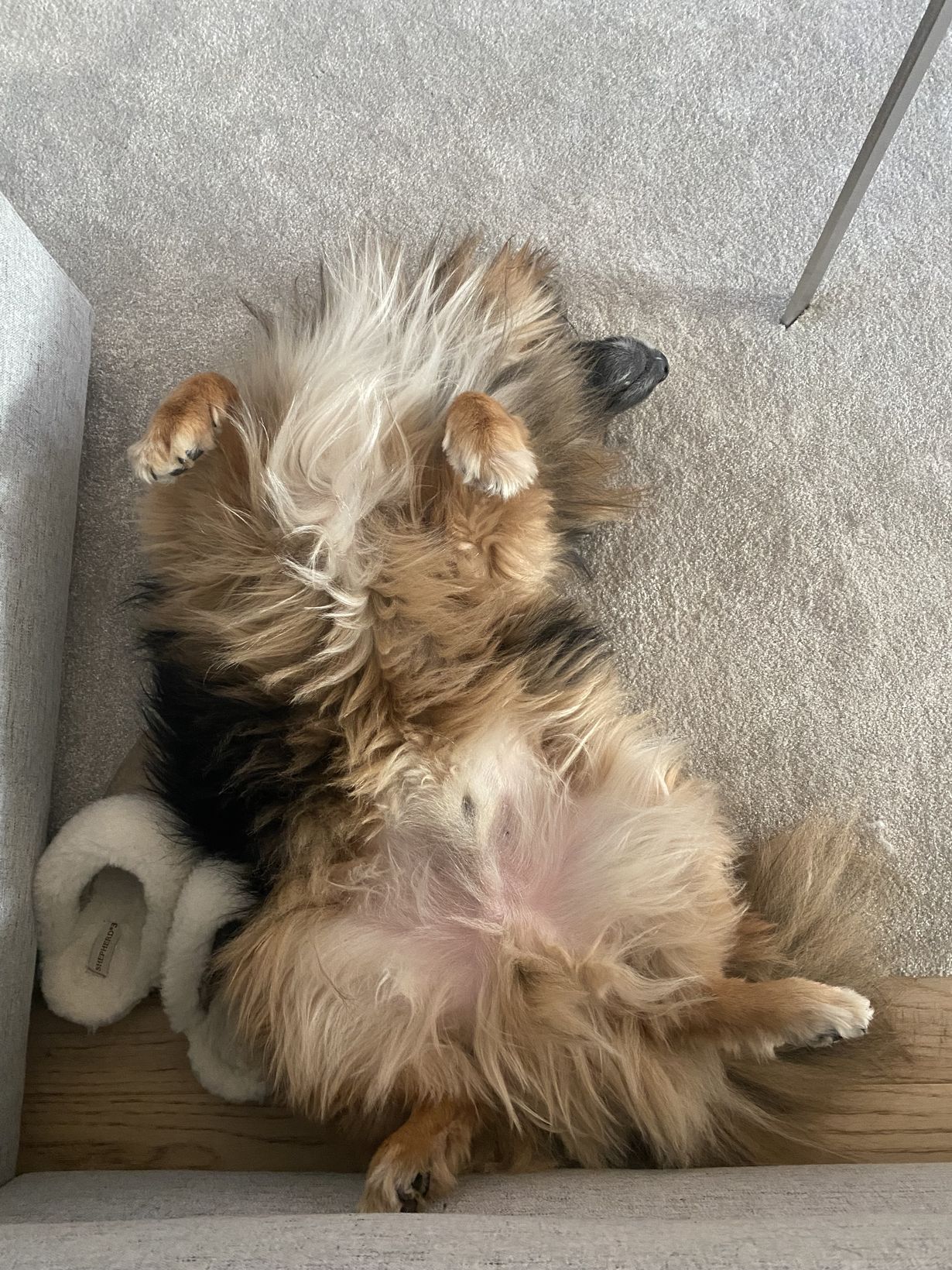 Justukselle on kyllä hankittu oma petikin, mutta parhaiten unet maittaa joko matolla tai lattialla - ja tässä asennossa!