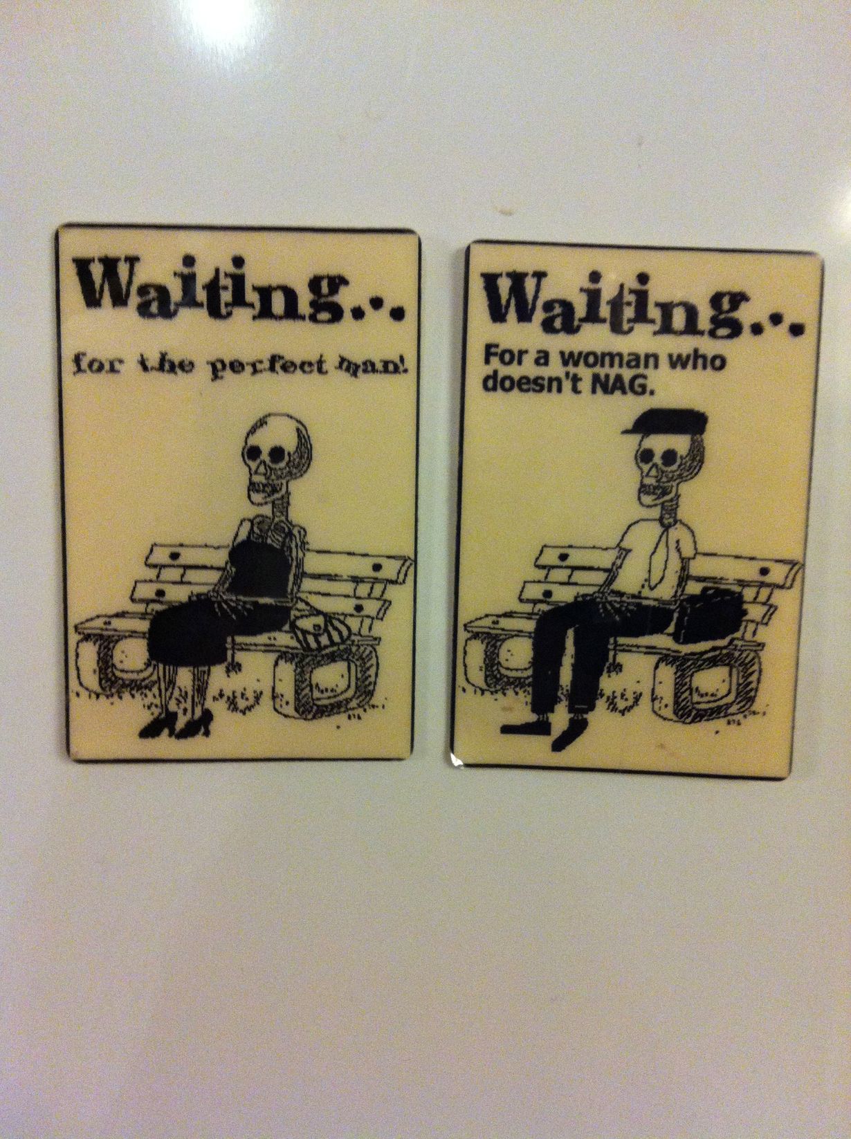 Ostin tämän magneettiparin kymmenen vuotta sitten Kanadan matkalta. Kuvat muistuttavat humoristisesti parisuhteen arjesta. Huumoria tarvitaankin pitkässä parisuhteessa!