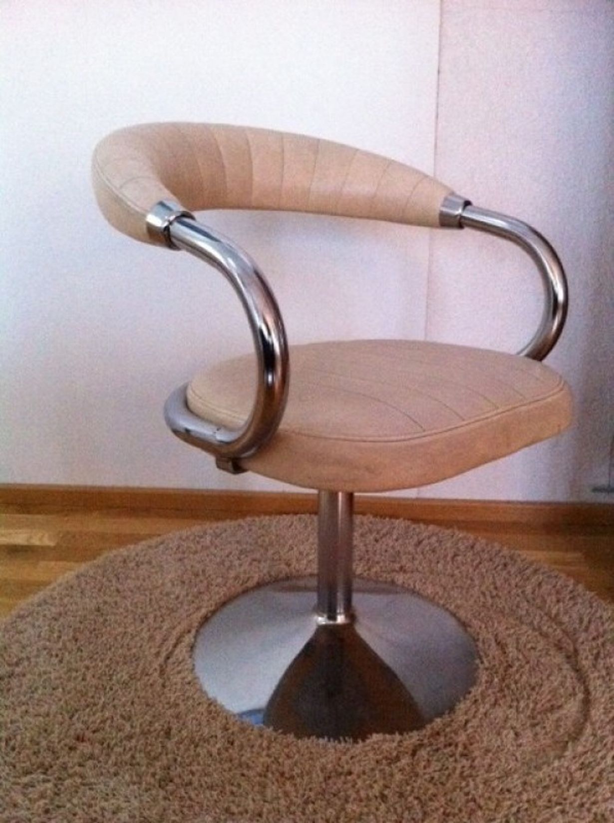Tuoli on ollut oppilaitoksessa parturikampaajalinjalla. Harrastan öljyvärimaalammista ja tuoli on vallan mainio apuväline siihen kun en saurauden vuoksi pysy maalaamaan seisten.