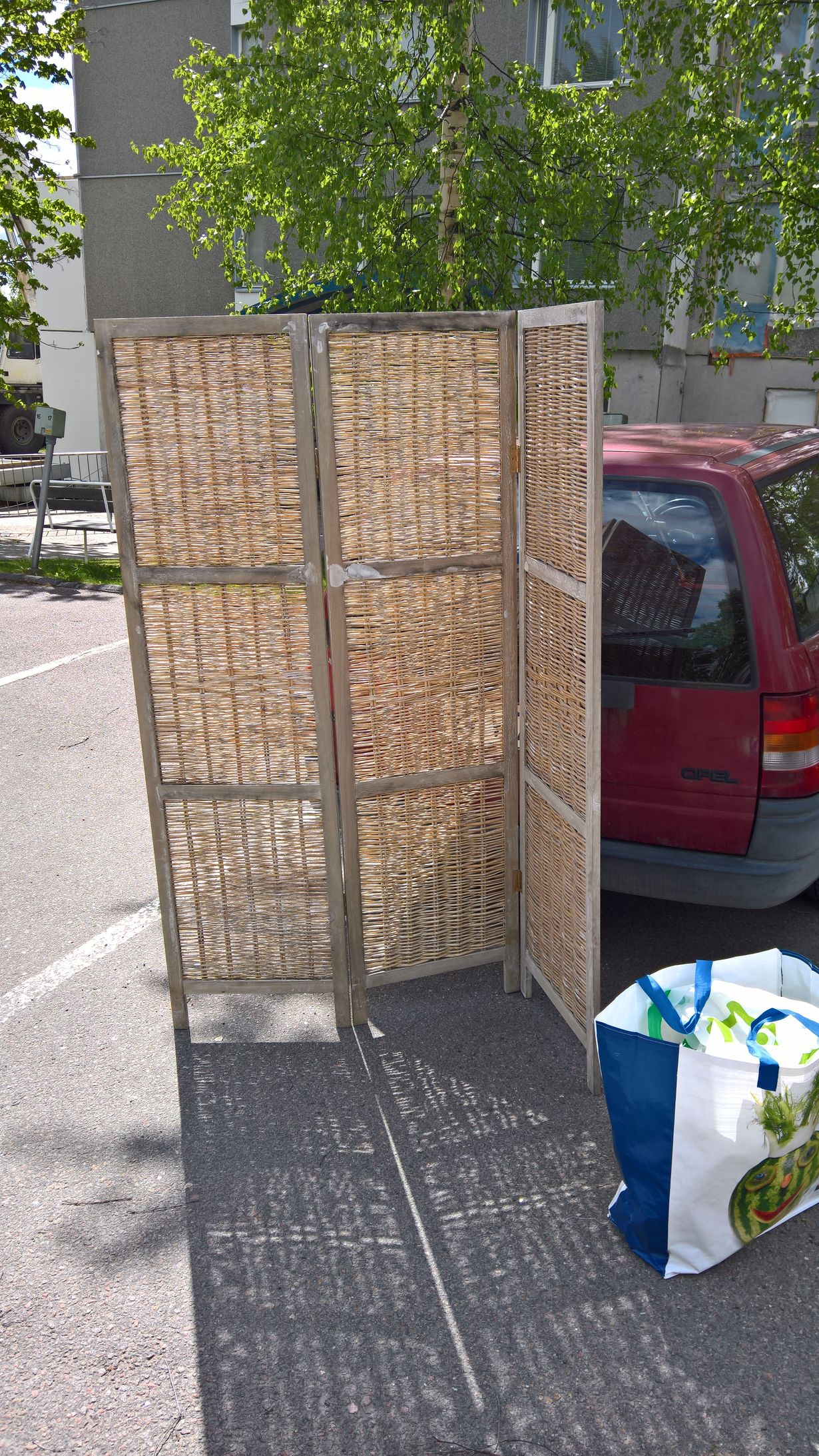 Kummityttö valitti liiasta auringonpaisteesta parvekkeellaan ja etsi jotain siirrettävää suojaa. Ei oikein löytynyt mieleistä niin tehtiin sermi oikein mittojen mukaan ja haluammallaan värillä.