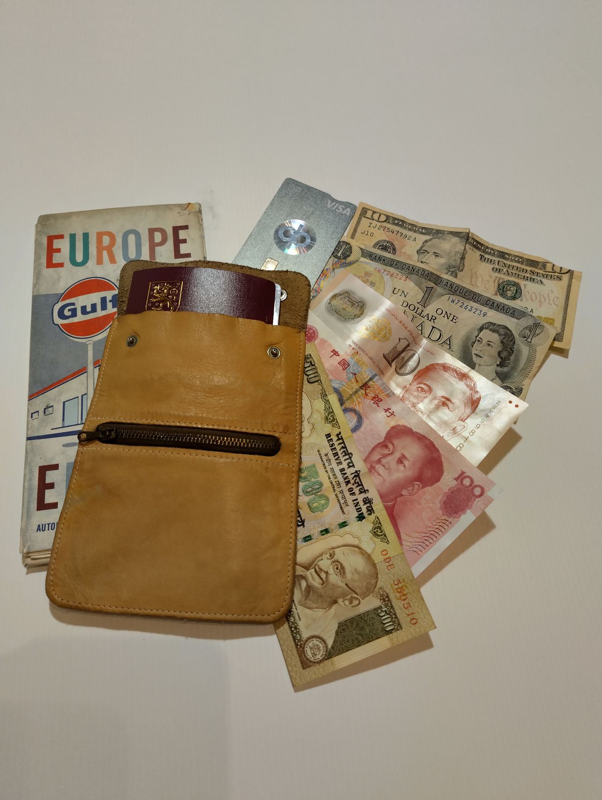Näillä varusteilla on kierretty maailmaa. Passi ja rahat pussukassa turvallisesti.
