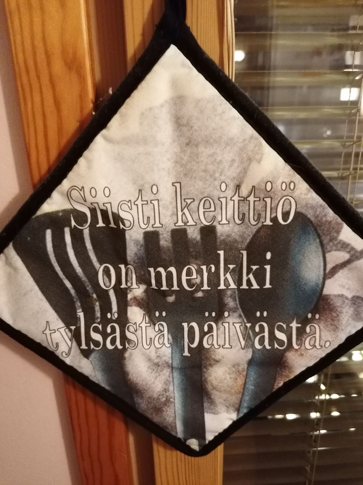 Lähetä kuvakisaan kuva patalapustasi - voita NOSH -lahjakortti! Patalappu tauluna Miia 12.11.2022 klo 23:11 Niin osuva mulle, että lahjaksi saatu patalappu on seinällä. Inhoan ruuanlaittoa.