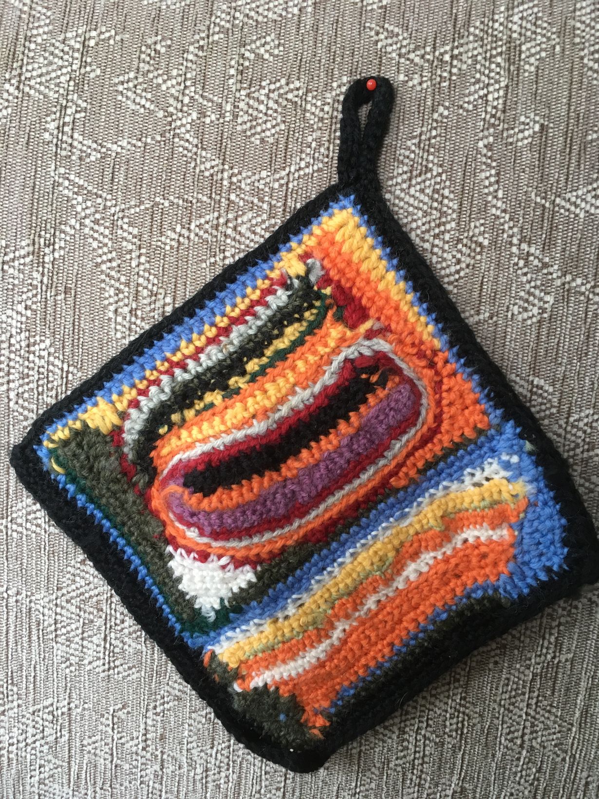 Nyt jo aikuisen sijaislapseni kovalla työllä 6 vuotiaana virkkaama patalappu jota iltaisin hänen nukahdettuaan salaa "suoristin" jotta siitä syntyisi se kovasti haaveiltu patalappu minulle lahjaksi. Tuottaa minulle mukavia muistoja siitä haastavasta elämänvaiheesta kun tytär oli vasta muuttanut perheeseemme. ?