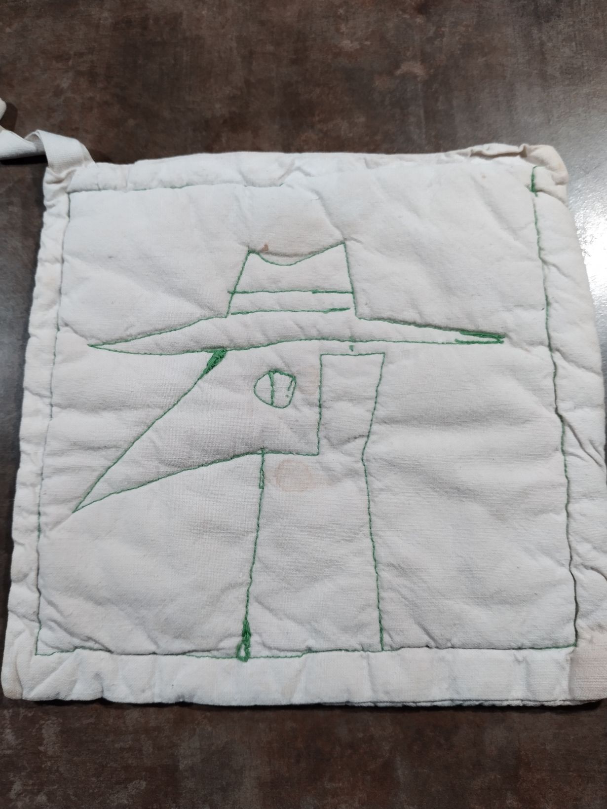 13 vuotiaan tekstiilikäsityö tunti tuotti koneella ommellun patalapun v.1990. Ollut käytössä yli 30 vuotta ja pesty koneella lukuisia kertoja, eli konepesun kestävä.