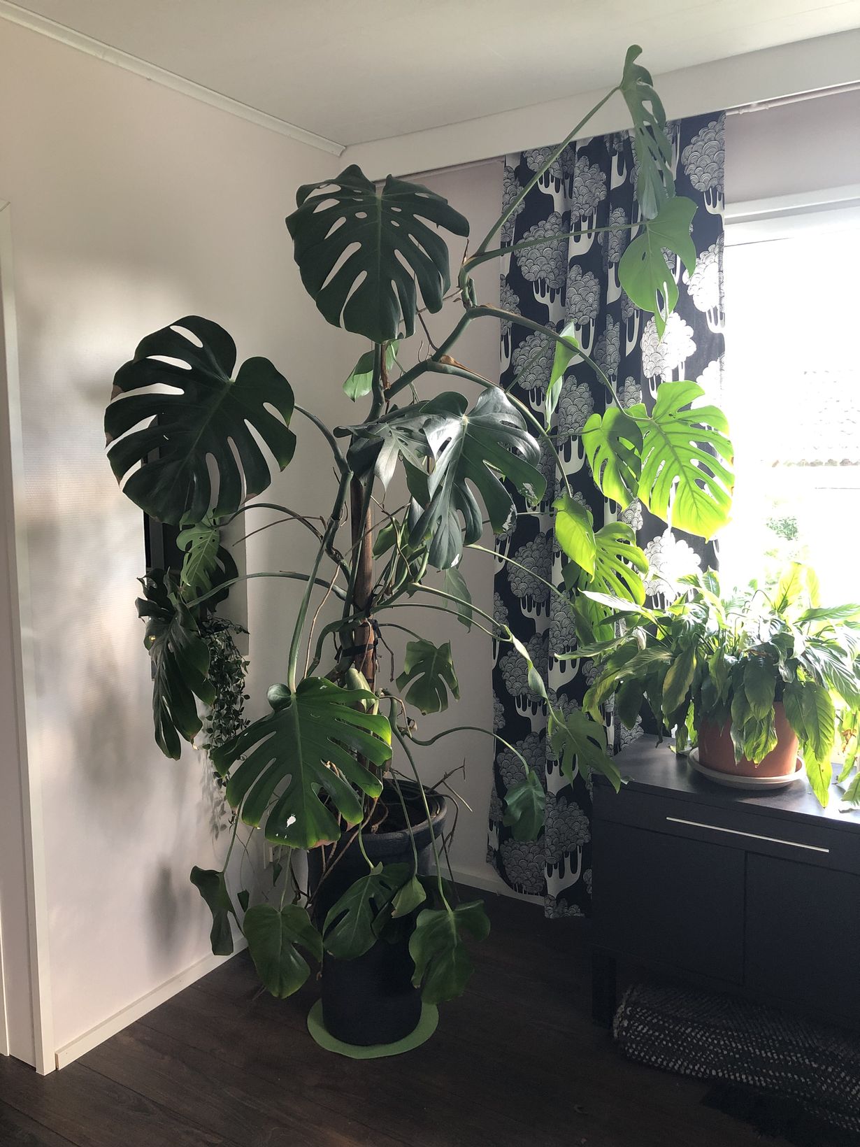 Ostimme alkuvuodesta rintamamiestalon ja saimme edellisiltä asukkailta muutaman ison viherkasvin, mm. tämän kattoon asti yltävän peikonlehden!