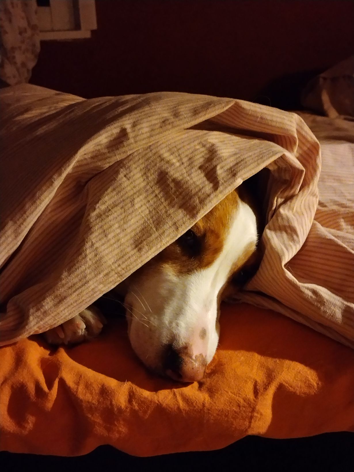 Koirani Pinja 4v. on pennusta lähtien hakeutunut aina peiton alle. Usein koirasta ei näy mitään; joskus nenä, hännän pää tai toinen takatassusta. Reissuun lähtiessä pitää muistaa ottaa koiralle oma peitto mukaan, koska ilman sitä ei uni vaan tule!