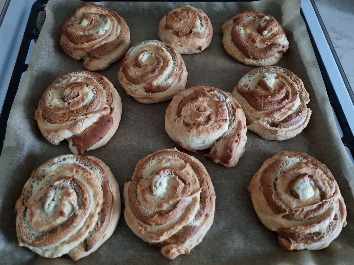 Piparitaikinalla täytetyt korvapuustit kuuluu joulunodotukseen, tällä kertaa täydennettynä appelsiinituorejuustolla.