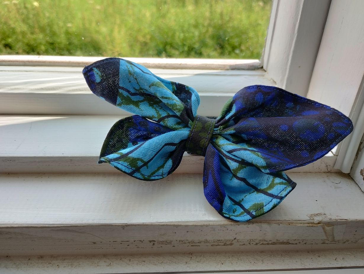 Löysin YouTubesta ohjeen, mitä muokkaamalla tein tyttärelleni kauan sitten Afrikasta mukanani tuomasta kitenge-nimisestä tärkätystä kankaasta hiuspompulaperhosen.