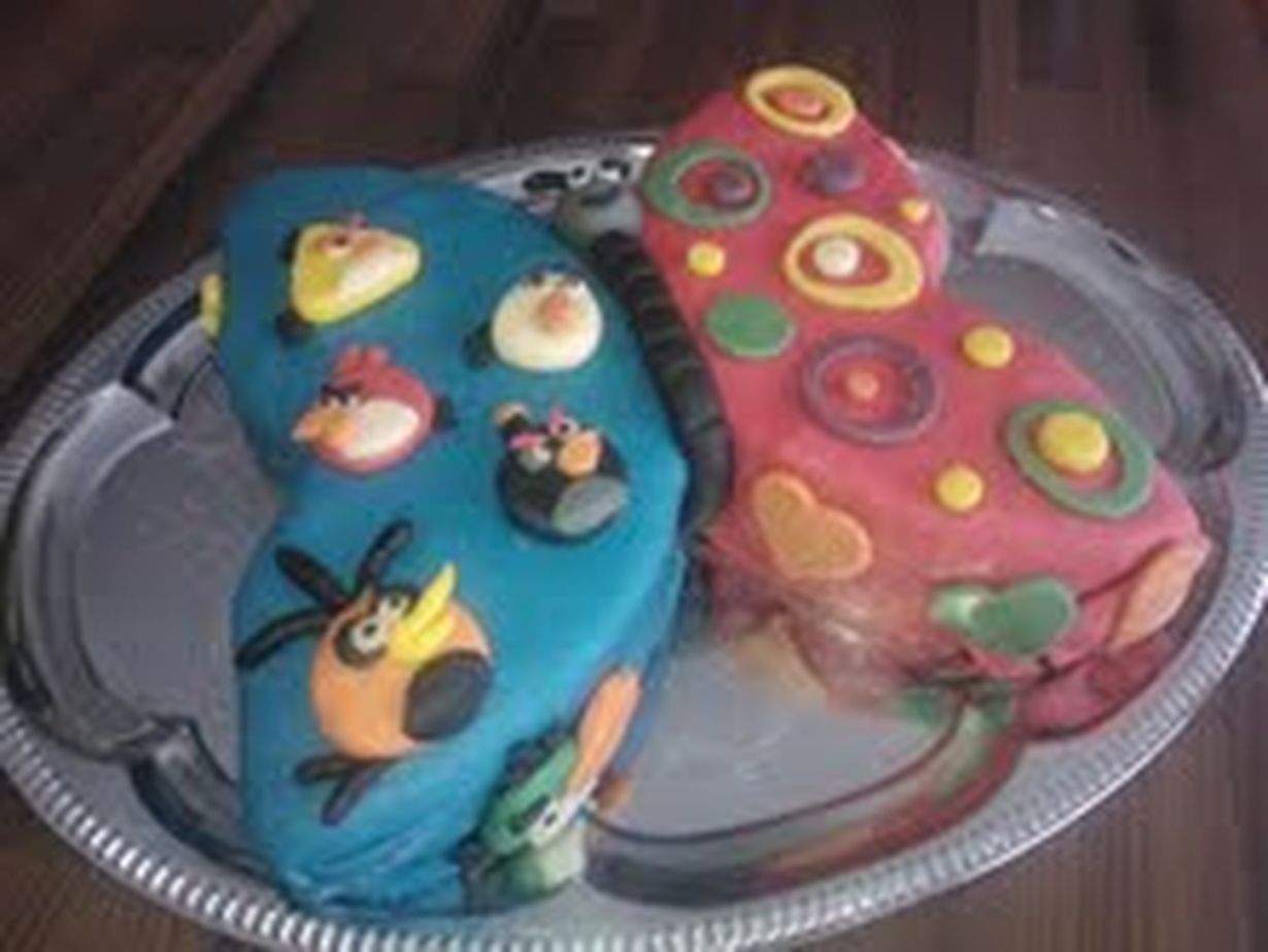 Peräkkäisinä päivinä synttäreitään viettävistä lapsista 5 v. täyttävä esikoinen tahtoi Angry Birds kakun ja 2 v. täyttävä kuopus perhoskakun. Yhteisissä juhlissa kakku oli tällainen.