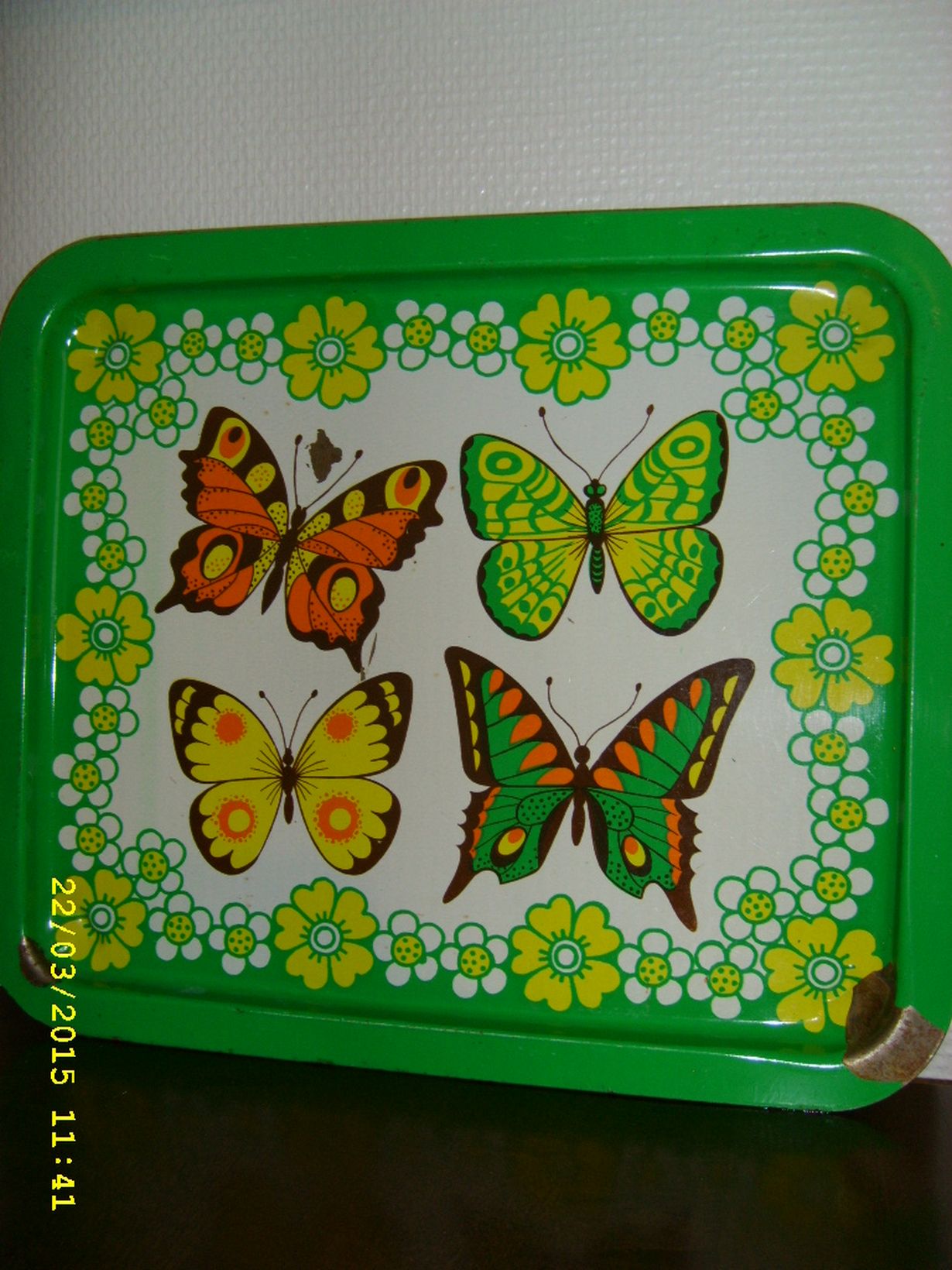 Tämä ihana arki: tarjotin perhostarjotin 22.3.2015 klo 10:35 Kirppikseltä muutama vuosi sitten ostettu retro perhostarjotin. Vähän jo ajanpatinaa pinnassa. Pirtsakka ja keväinen! Krisse