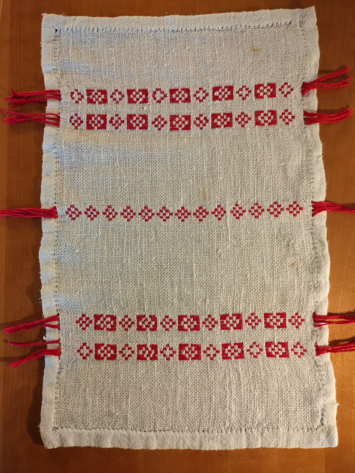 1980-luvun lopussa tyttäreni käsitöissä tekemä pikkuliina on koristanut kotia joulun liinana. Taitavasti opetettu, hyvistä materiaaleista, neulalla tehty pujotustyö päätyreunojen koristepistoineen on kestänyt aikaa.