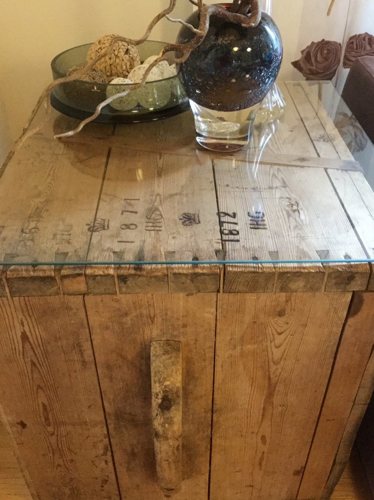 Miehen lapsuudenkodin aitasta löytynyt tynnörin viljamitta toimii sohvapöytänä. Käänsimme sen kyljelleen, että kruununleimat (vuodesta 1868 lähtien) näkyisivät paremmin.