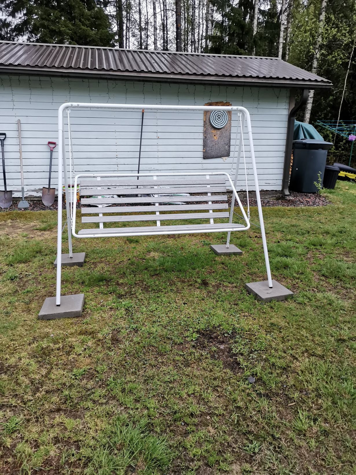Pitkän haaveilun jälkeen ostin itselleni äitienpäivälahjaksi pihakeinun. Tämä malli sopii hyvin rintamamiestalon pihaan. Mummolassa oli aikoinaan tämmöinen, tosin siinä oli katos. Tässä on mukava istua, tosin keinuminen pitää jättää vähemmälle, muuten tulee paha olo.