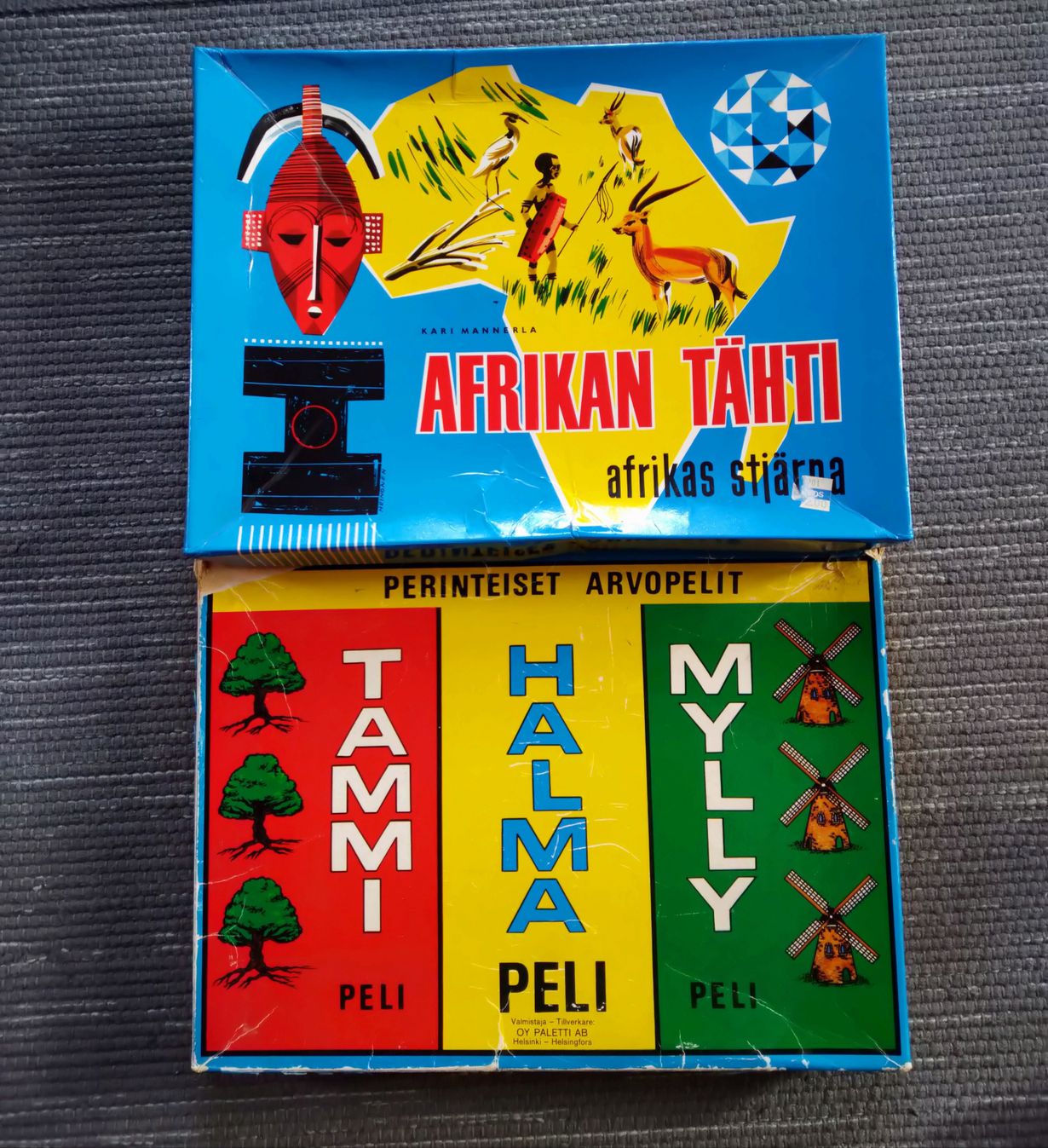 Afrikan tähti on jo omasta nuoruudesta tuttu ja on edelleen perheemme lempipeli. Tammi-halma- ja myllypelit olivat mökillä myös sadepäivän mukavaa ajankulua. Nyt pelien salaisuuksia opetetaan lapsenlapselle.
