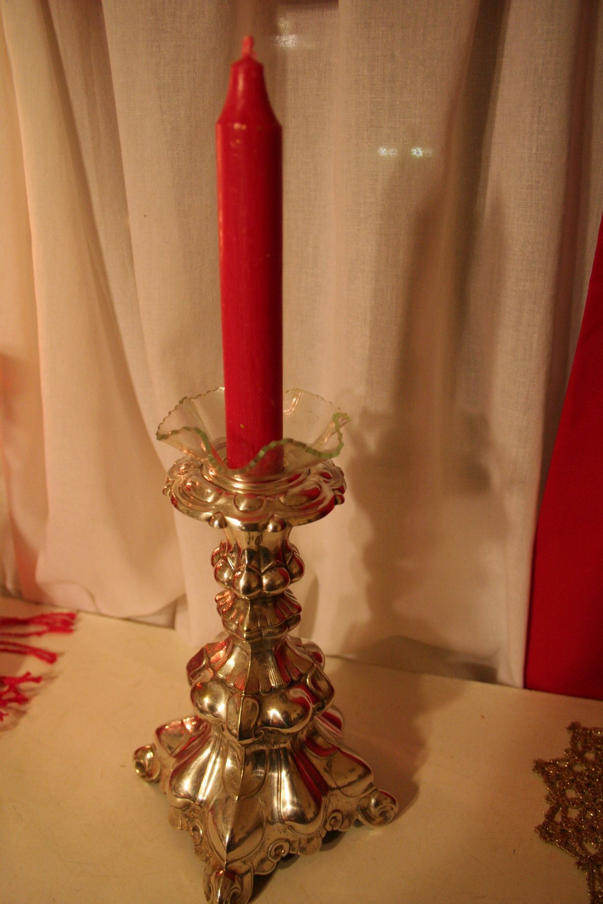 Tämä kynttilänjalka aiheutti minulle väristyksiä lapsena tehtäviini kuului sen kiillottaminen jouluksi, jokaisen kolon ja krumeluurin piti hohtaa. Nykyäänkin saan siitä väristyksiä, positiivisia sellaisia, krumeluurit saavat tummua rauhassa.