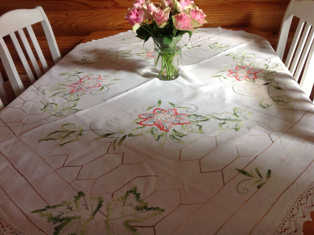 Mummini oli syntynyt vuonna 1887 ja liina on ommeltu 1900 luvun vaihteella. Muistan pienenä tyttönä mummolassa ollessani, että liina levitettiin pöydälle vain juhlapäivänä.