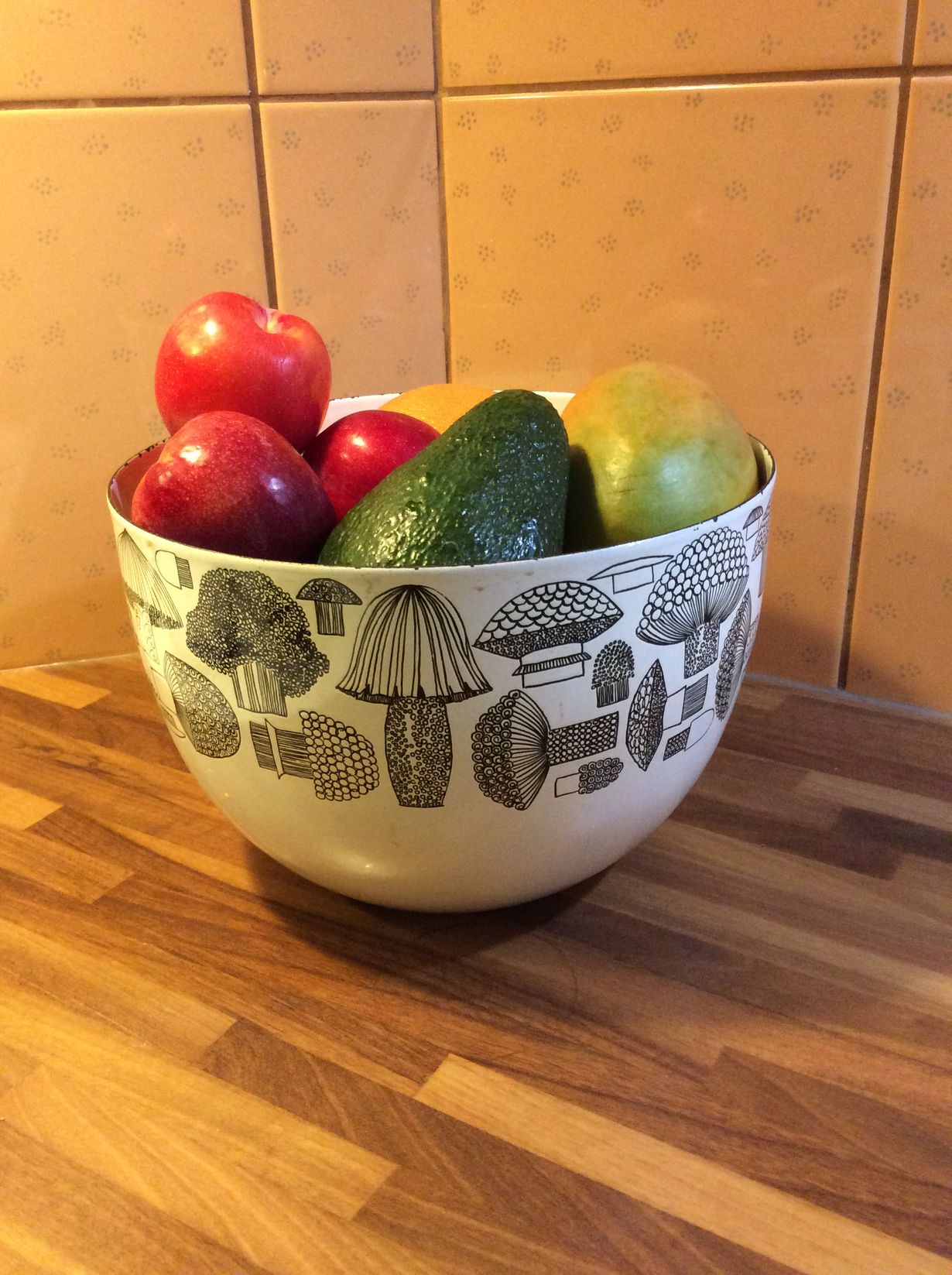 Äidin perintönä saatu Ester Tomulan suunnittelema emaliastia on mitä mainioin hedelmämalja;kaunis katsella ja houkuttelee syömään hedelmiä.