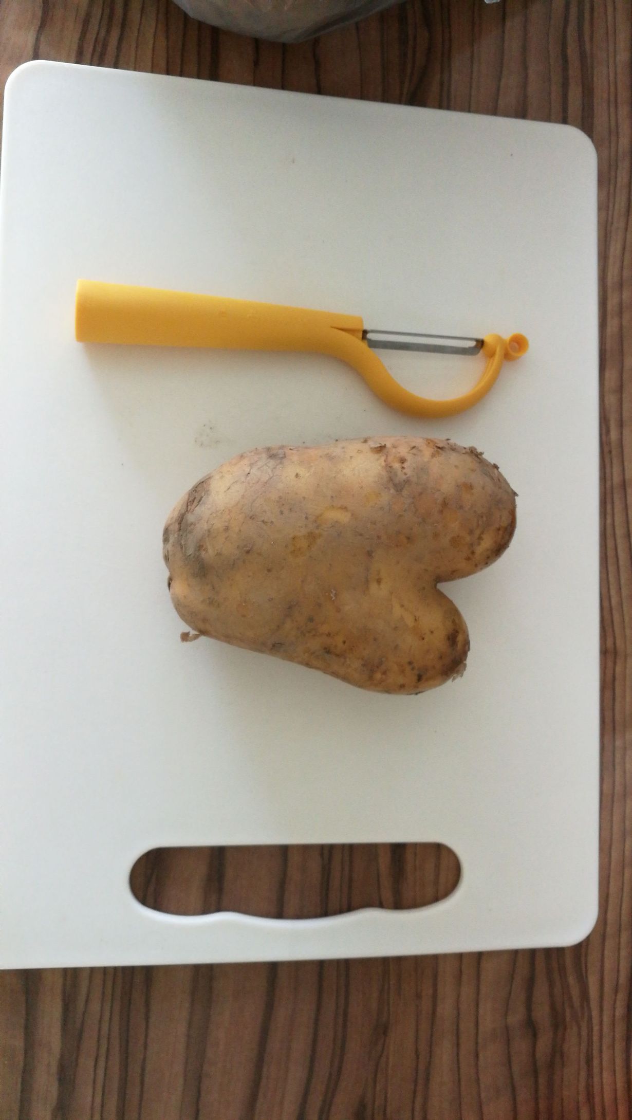 Kaupan perunalaarissa tuli vastaan tämä valioyksilö. Pakkohan tämä sydämellinen pottu oli poimia talteen. Se pääsi osaksi rakkaudella keitettyä makkarasoppaa.