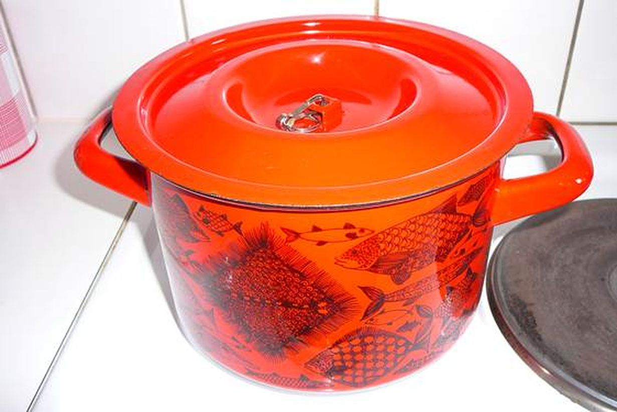 Tässä Esteri Tomulan Finellille suunnittelemassa emalikattilassa ovat perunet kiehuneet meillä jo 1966 vuodesta asti. Laitan sisälle myös kattilaan sopivan lävikön ja hyvää tulee. Kattilan kannesta on nuppikin aikojen saatossa lähtenyt pois.