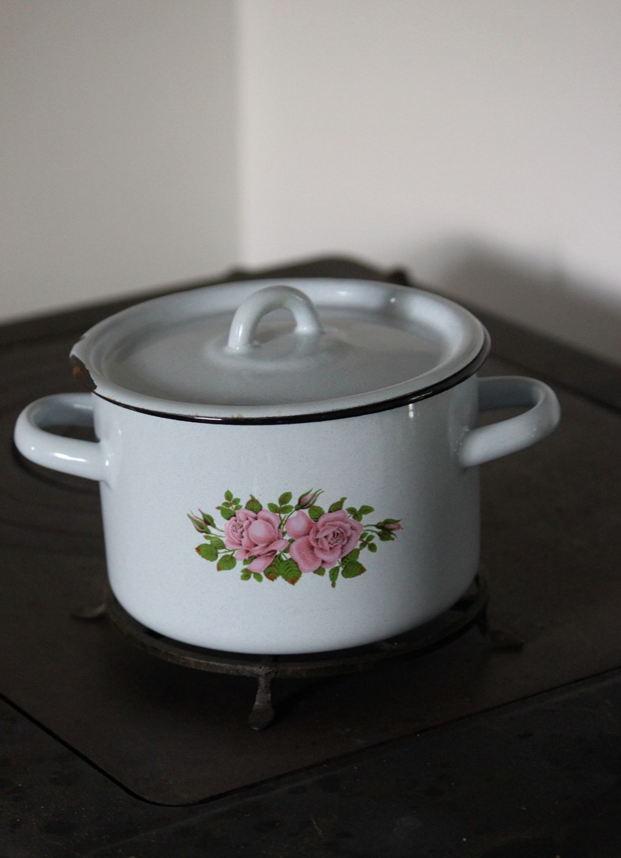 Uskollisesti palvellut vanha emalikattila...kesäisin keitellään ulkona ja talvet sisällä