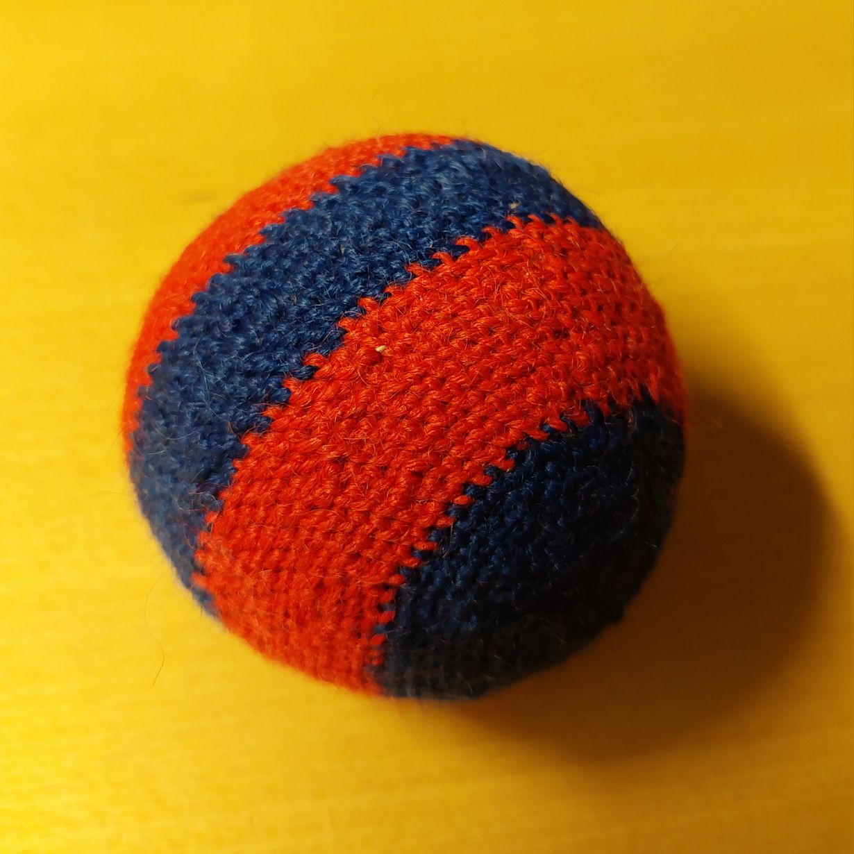 Pallo on tehty kansakoulun 1. tai 2. luokalla. Kova sisus on muotoiltu pullonkorkeista, sanomalehdestä ja narusta. Päällinen on ommeltu pykäpistoin villalangasta. Ihme, että niin pienenä osasin tehdä näin siistiä työtä.