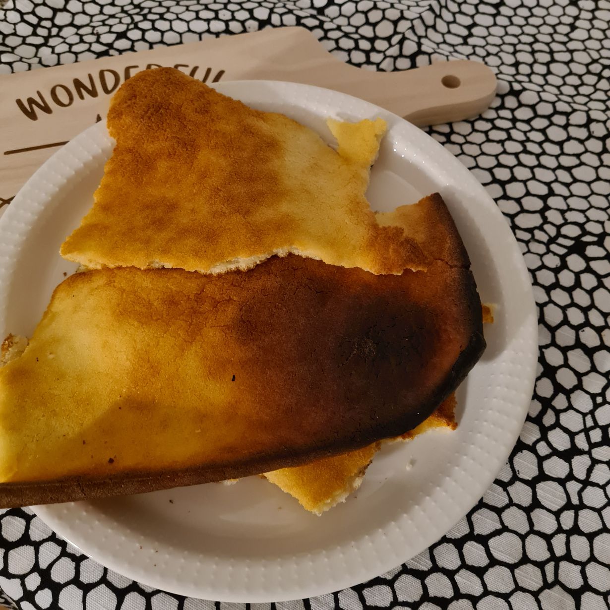 Pannukakkua tekemässä, taikinaan lisäsin vahingossa hyppysellisen leivinjauhetta, jota ei käytä pannukakussa, lisäksi tummui reunoilta. Oli lätistynyt versio.