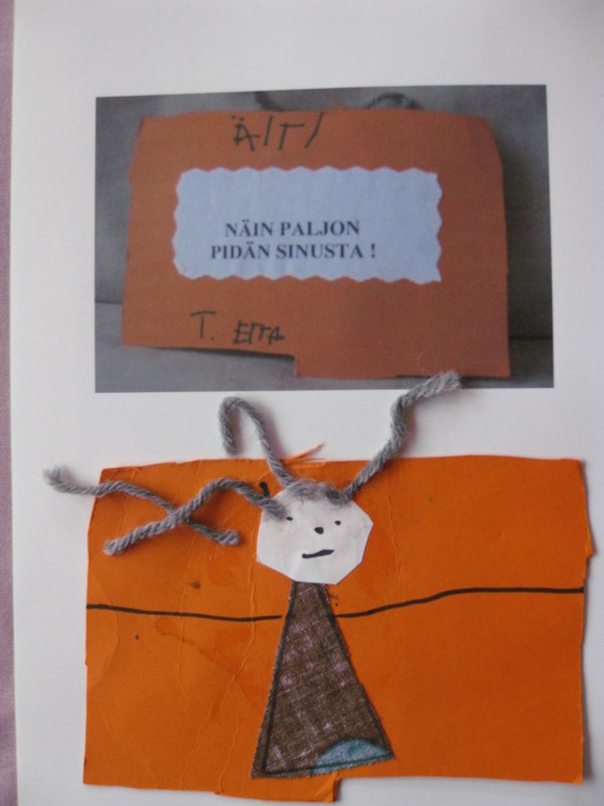 Sen on tehnyt keskimmäinen poikani n. 3 vuoden ikäisenä päiväkerhossa. Siinä näkyy aidosti lapsen oma kädenjälki (ja oma nimikin vielä peilikirjoituksena).