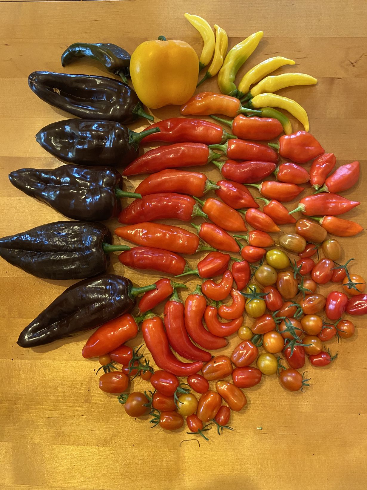 Kasvatamme mökin kasvihuoneessa chilejä ja tomaatteja. Tomaatit ehditään syödä sitä mukaa, mutta chileistä riittää säilöttäviksi etikkaliemeen ja pakkaseen.