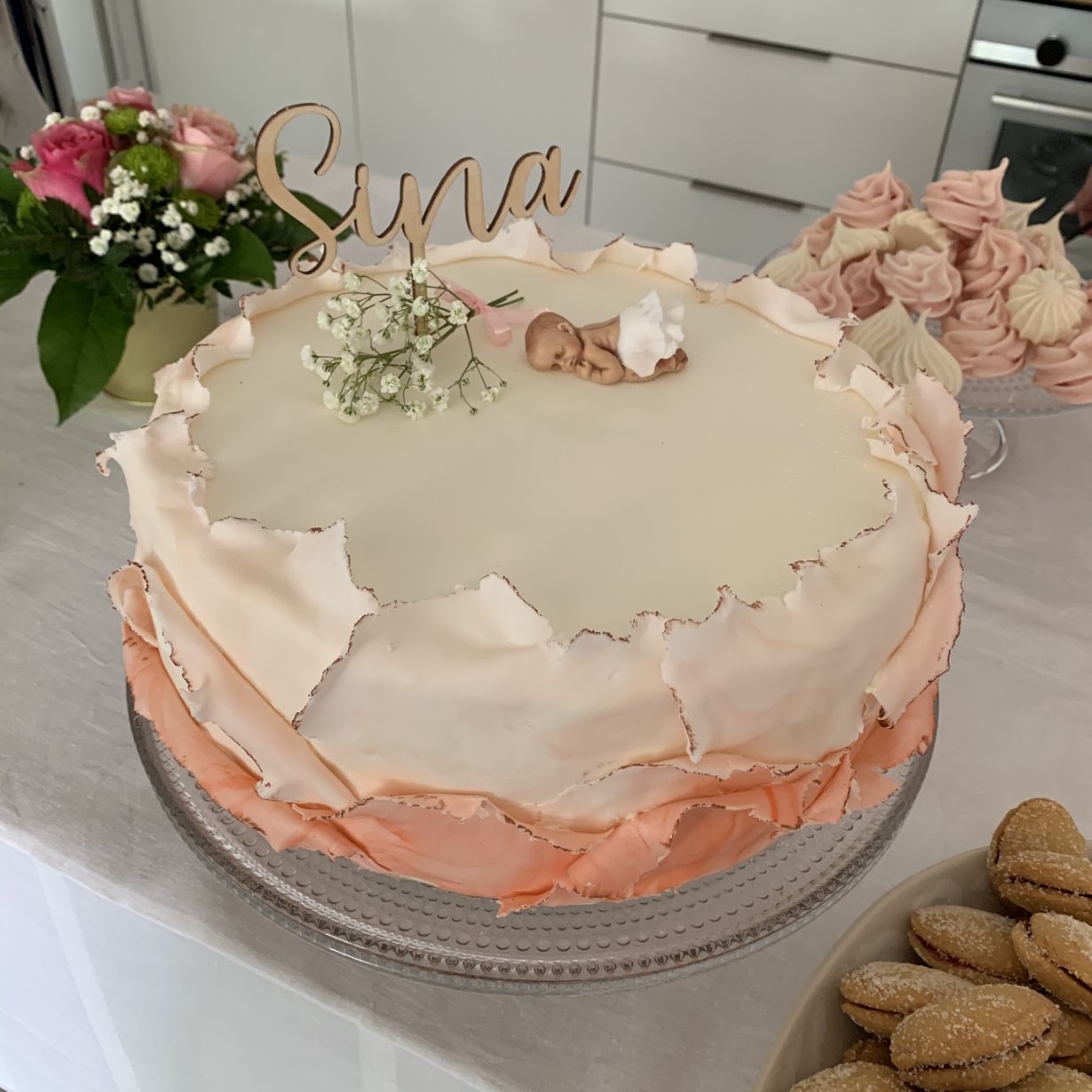 Ystäväni sai hartaasti toivomansa lapsen ja minusta tuli hänen kummitäti. Koska olen harrastanut kakkuja, pyysi hän tekemään kakun neidin juhliin. Kakun reunassa on marmorivärjätty vaahtokarkkimassa, jonka revityt reunat on viimeistelty kultavärillä.