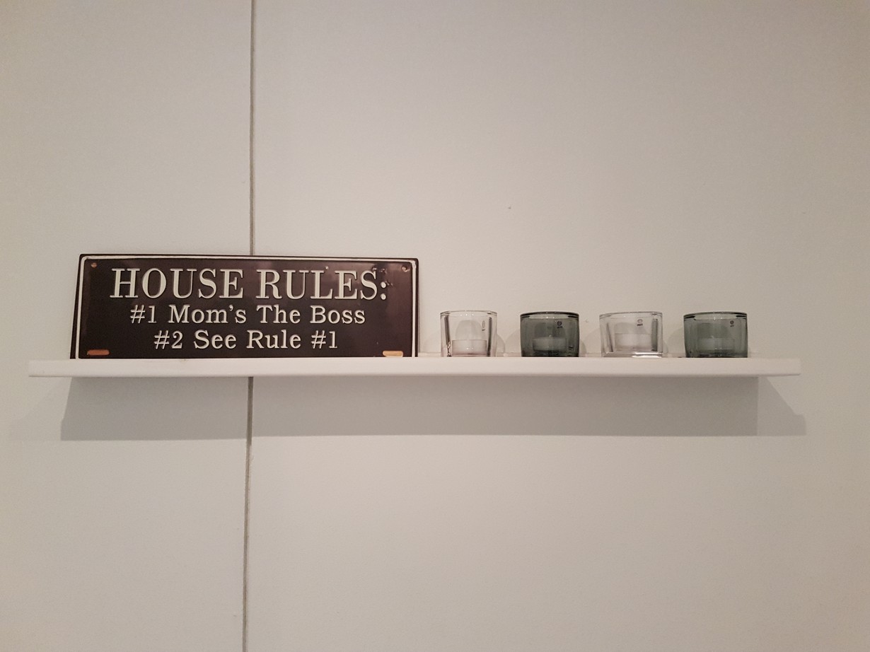 Minulla on tauluhylly eteisessä. Pidän siinä tuikkuja ja miehen mielestä vitsikästä kylttiä. Minusta kyltti on totista totta ;)