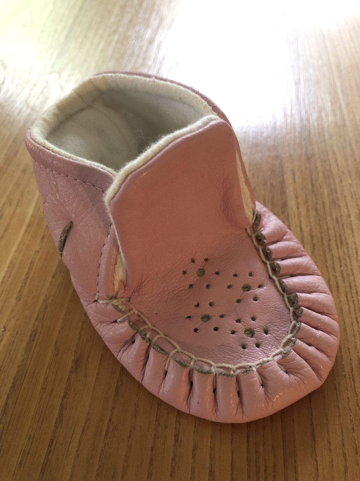 Vanhin yksittäinen vaatteeni on tämä pieni pariton pinkki tossu. Tossut ovat olleet minulla vauvana ja tämä on mielestäni maailman suloisin, vaikka pari onkin kadonnut vuosien varrella.
