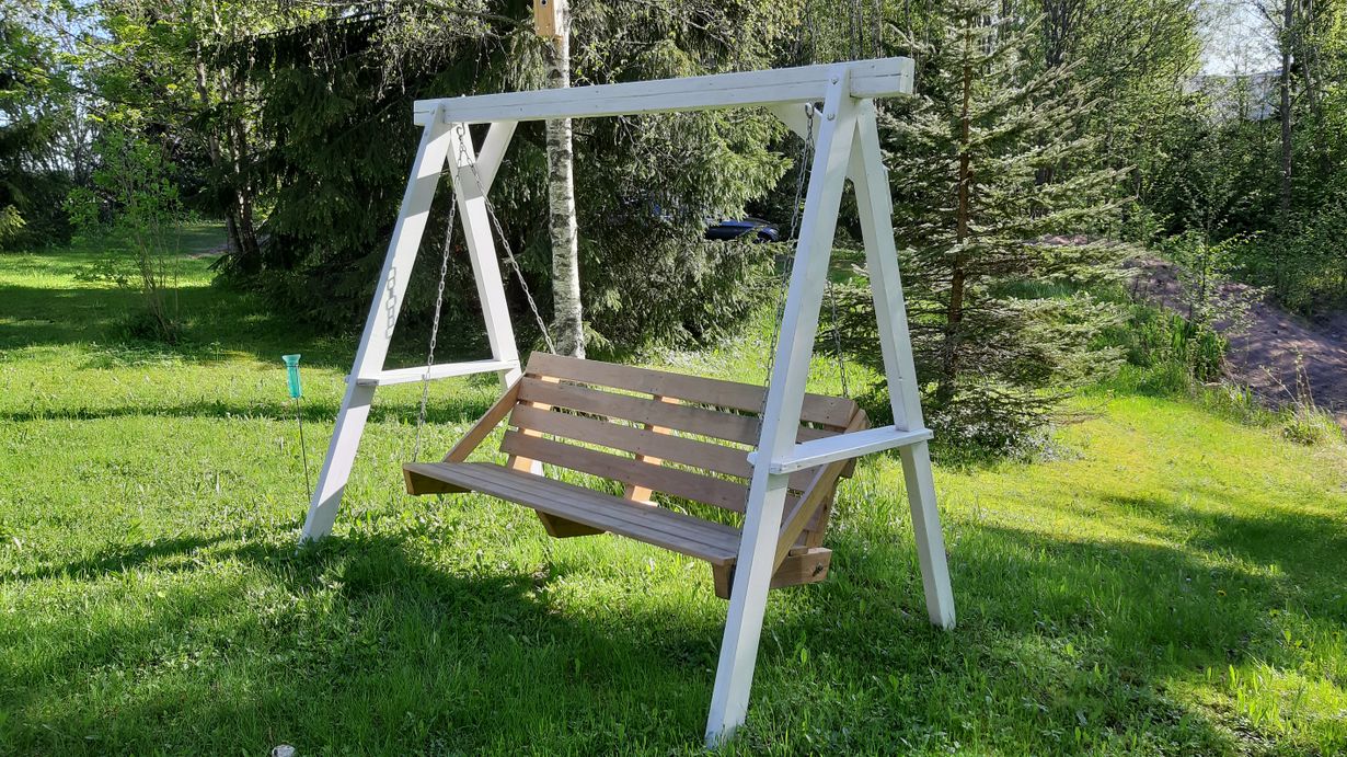 Mieheni sai parikymmentä vuotta sitten lahjaksi isältään tämän tekemän keinun. Istuinosa on jo hajonnut, mutta mieheni teki uuden vanhoihin sivuosiin.