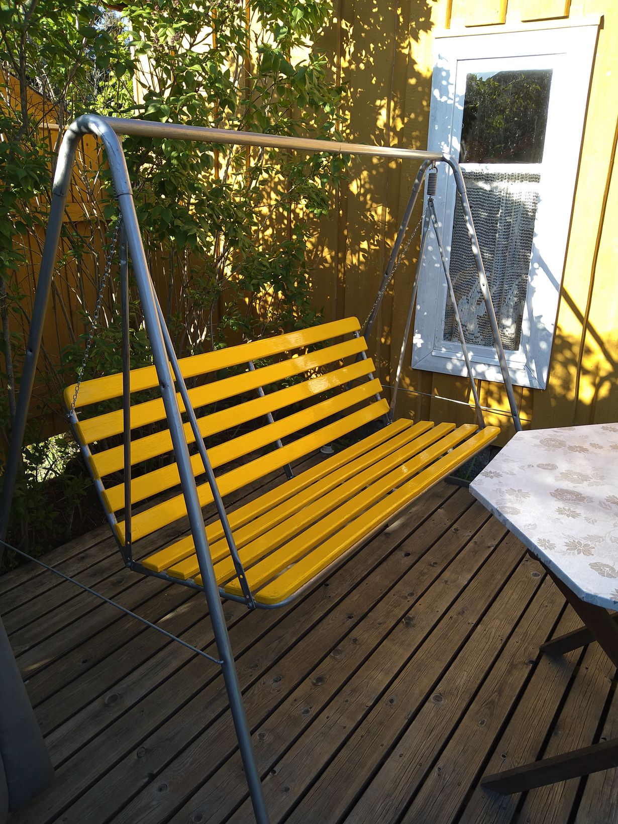 Tyttäreni kunnosti anopin vanhan keinun, joka on nyt pihamme väripilkku.