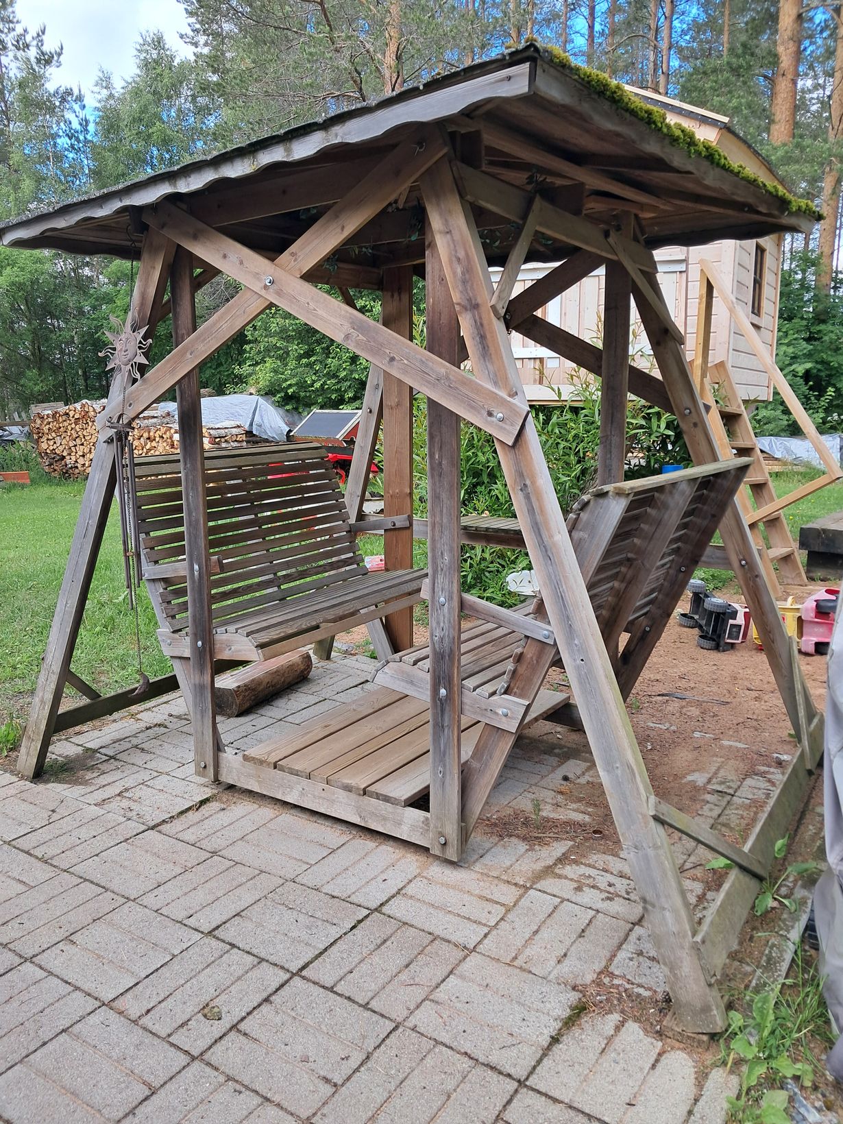 Sain hartaasti toivomani keinun 16 vuotta sitten lahjaksi lapsiltani ja mieheltä. Katselen kiikussa kaukaisuuteen aikaisesta keväästä pitkälle syksyyn. Se on kuin lämmin syli, suojassa auringon paahteelta ja vesisateelta. Voin seurata siinä pihan tapahtumia, lasten leikkejä ja koirien nuuskutushetkiä. Katto sai vähän osumaa, kun pihapuu otti kaadettaessa kontaktia, mutta sekin on korjattavissa.