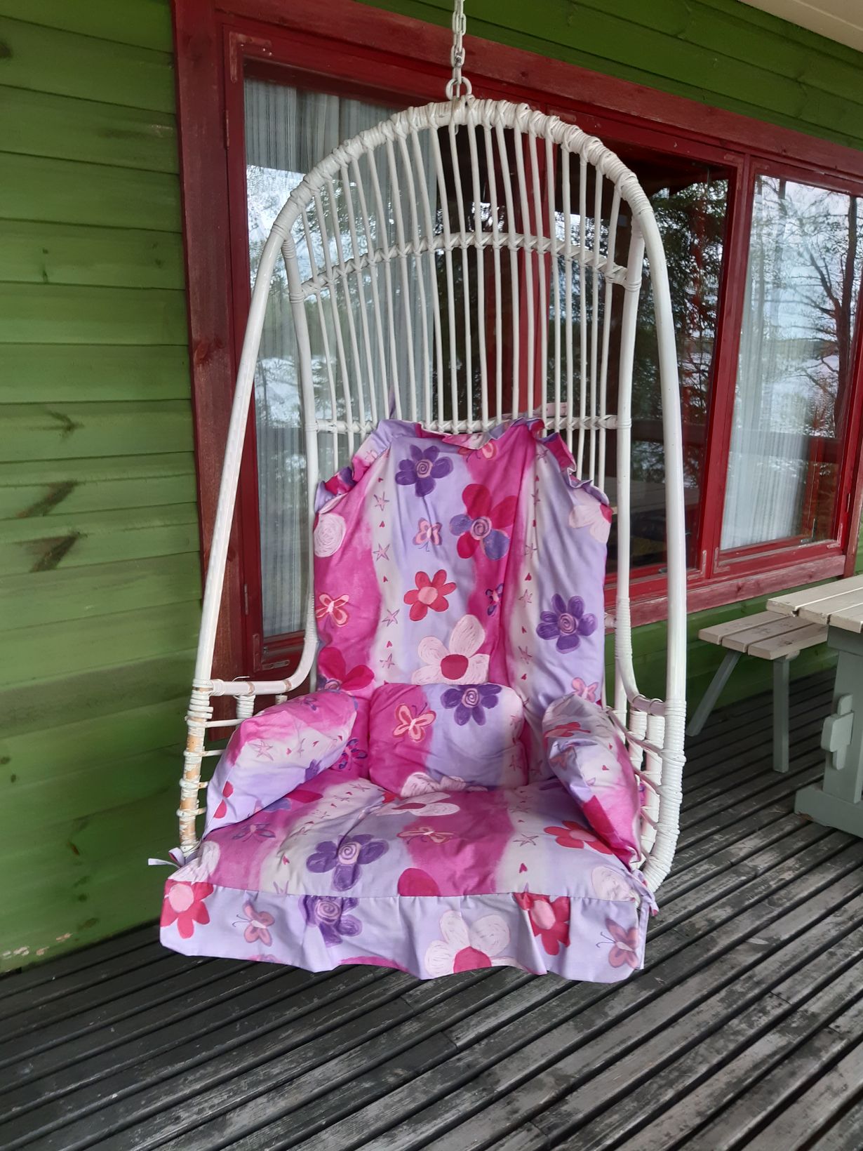 Ihana rottinkikeinuni riippuu saunamökin kuistilla. Olen ostanut keinun kesätyörahoillani teinityttönä 80-luvulla. Äiti on ommellut tyynypäällisen. Olen keinunut sinisessä kamarissa ja lilassa olohuoneessa neitovuosieni kodeissa. Nyt voin seurata rantaluontoa keinussani.