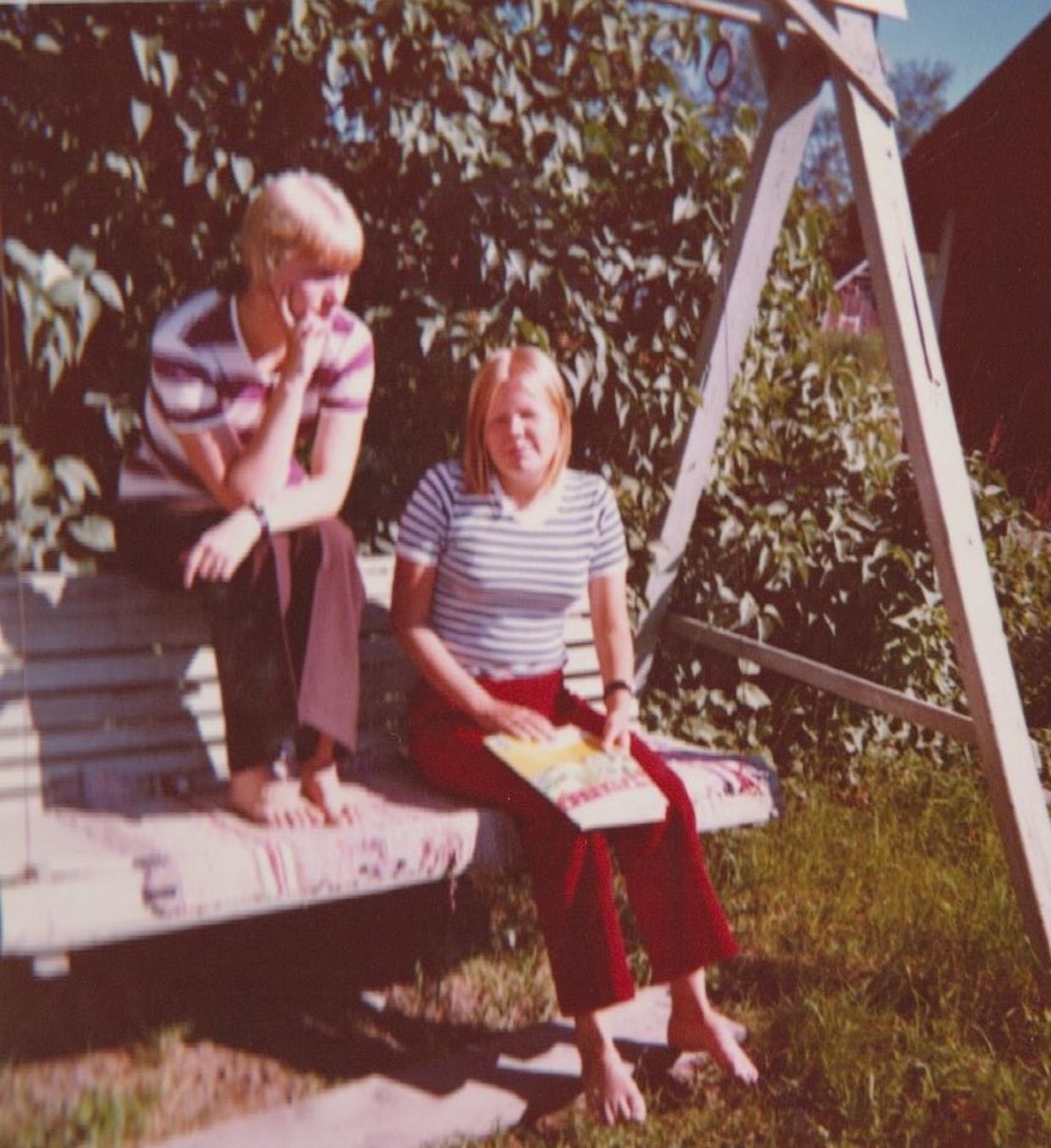 Tässä pihakeinussa odotamme iltaa, sillä olimme menossa Liperin lavalle katsomaan Mattia ja Teppoa ja tietenkin kuulemaan heidän hittinsä Kissankultaa. Kuva v. 1971.