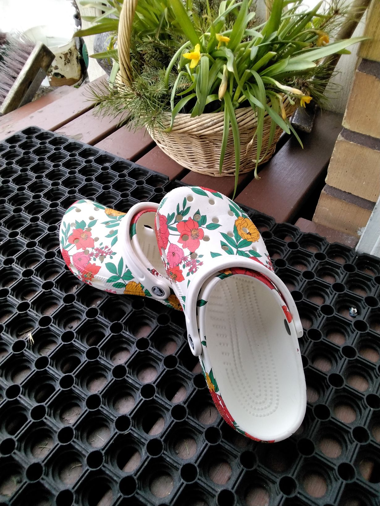 Nämä kukkacrocsit olen saanut tyttäreltäni äitienpäivälahjaksi muutama vuosi sitten. Enhän minä raskinut näitä heti pihakengiksi laittaa, vaan käytin ensi alkuun vain sisällä!