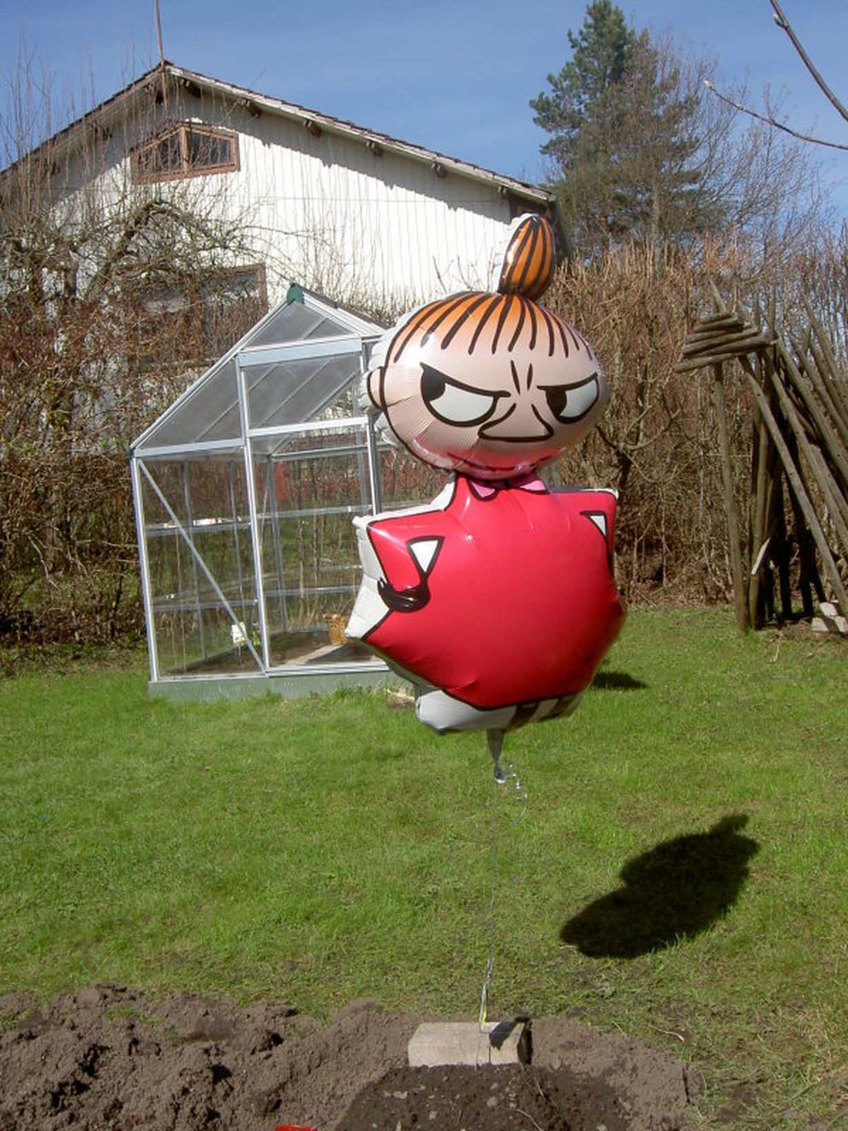 Pikku Myy foliopallo on paitsi ihana, niin myös erittäin toimiva linnunpelätin. Kasvimaalla tuppasivat linnut kaivelemaan siemenet esiin, mutta nyt saavat penkit olla rauhassa.