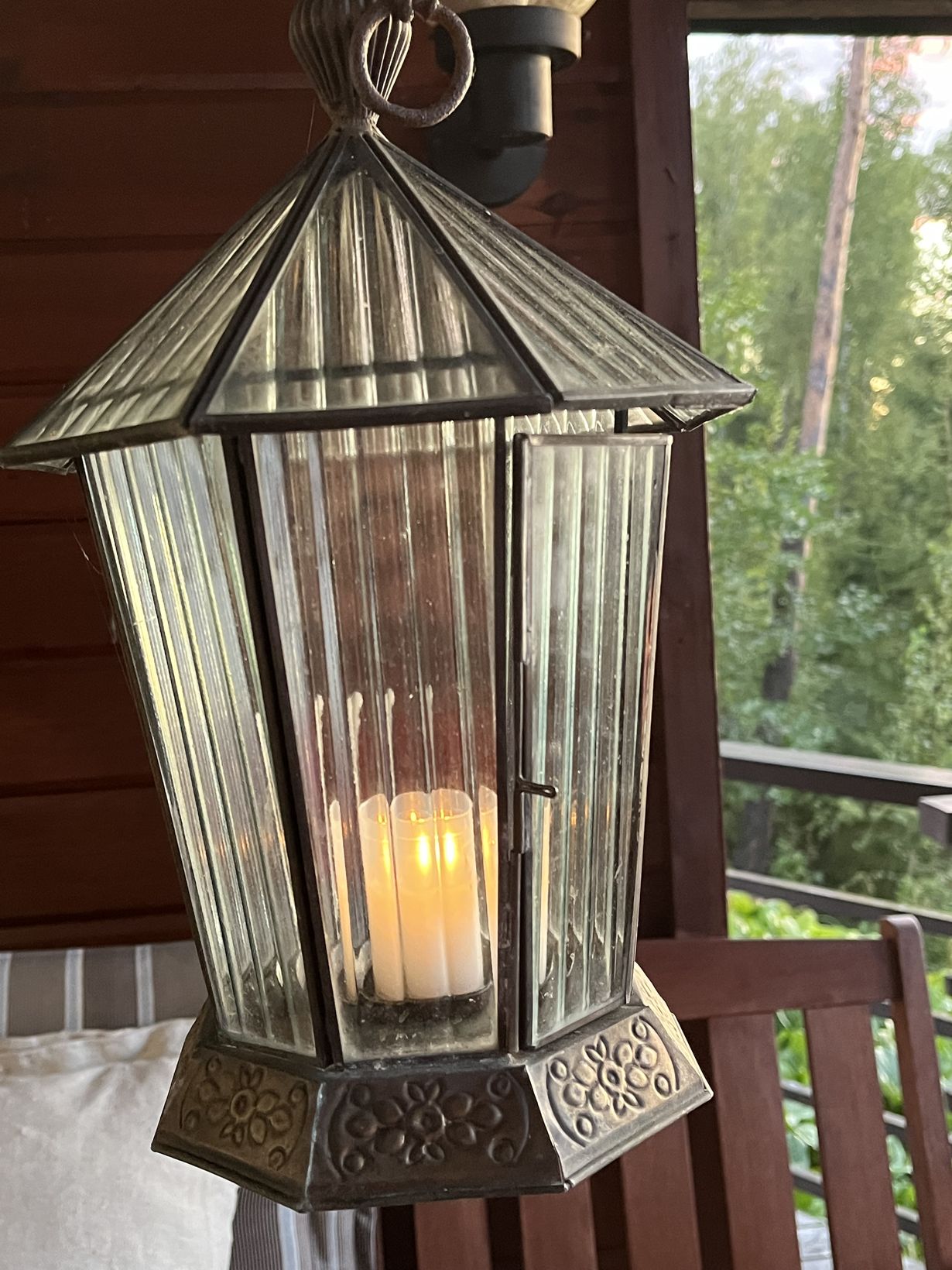 Lyhdyn olemme saaneet tuliaisena n30 vuotta sitten hyviltä ystäviltämme. Se ripustettiin terassin pöydän ylle silloin ja siinä se on ollut ja siinä on poltettu paljon kynttilöitä syksyn hämärissä.