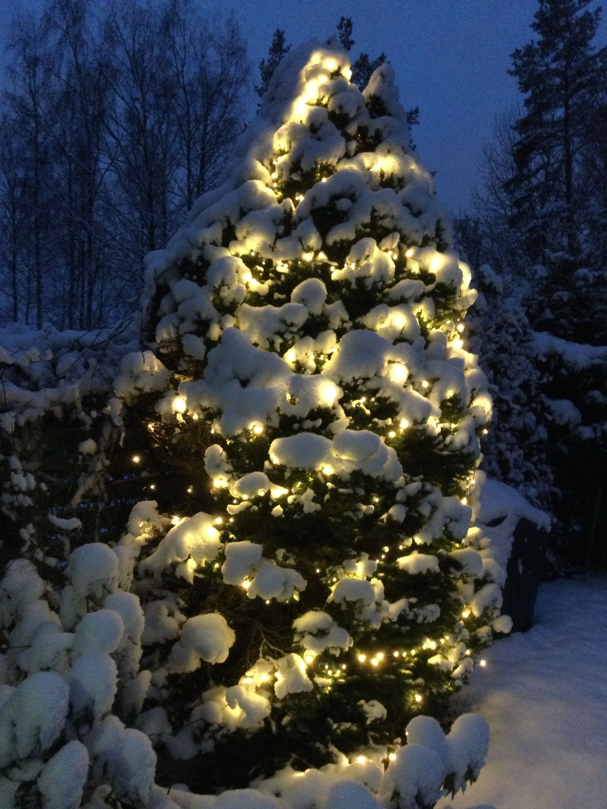 valaistu luminen pihakuusi luo taianomaista tunnelmaa.