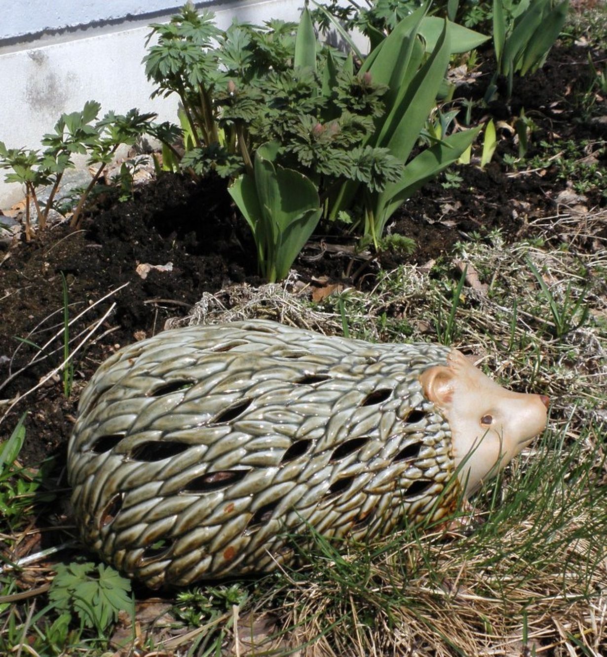 Tämä siilimuori vartioi ulko-oven vieressä perennapenkkiä, olen saanut sen kälyltäni vajaa 10 vuotta sitten ja talvella siilimuori tuikkii valoa kun masuun laittaa tuikkukynttilän.